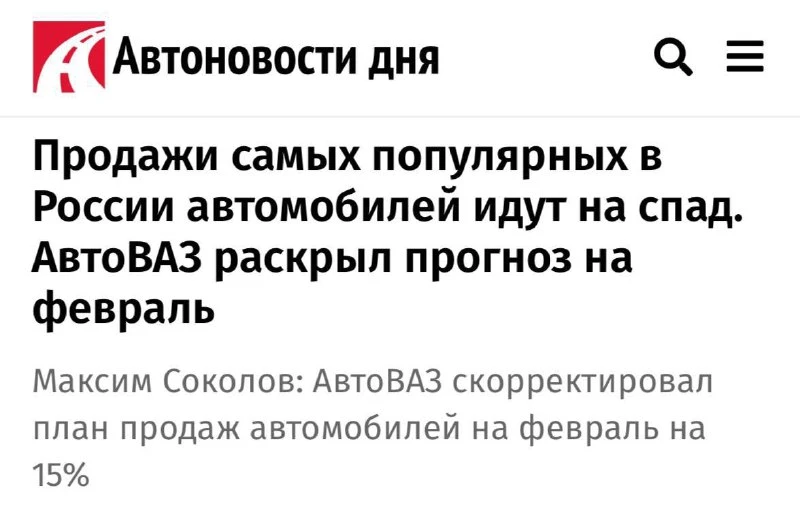 «Мы уже скорректировали планы на февраль, причём скорректировали на 15%, но по темпам продаж сегодня не выходим даже на эту траекторию корректировки», — заявил глава АвтоВАЗа Максим Соколов.