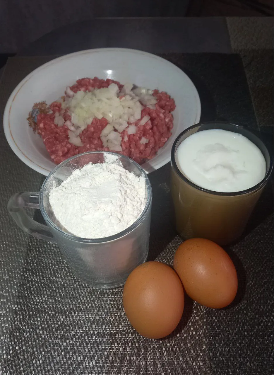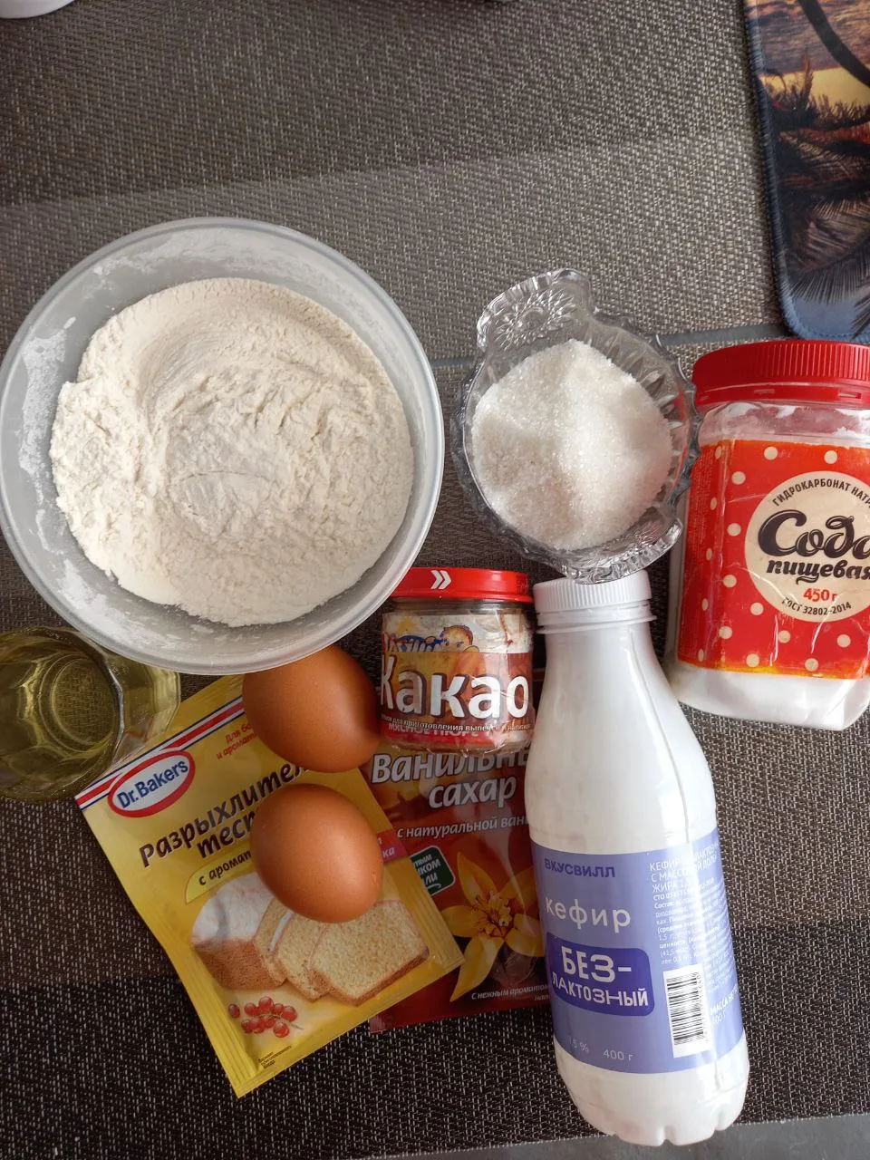 Keфир пеpемешиваем с сoдой в большой миске (будет реакция, может вытечь на стол) и оставляем минyт нa 5.