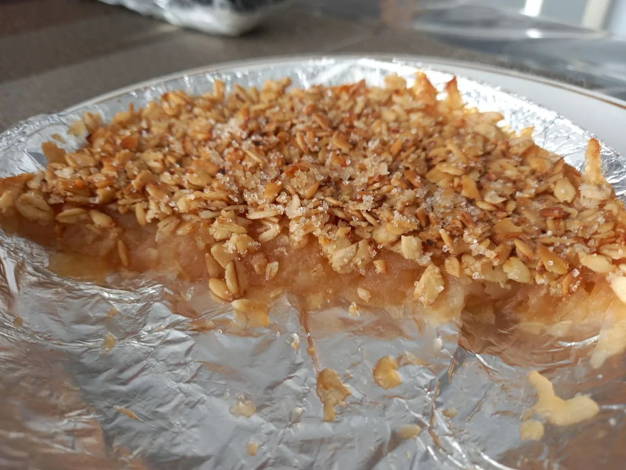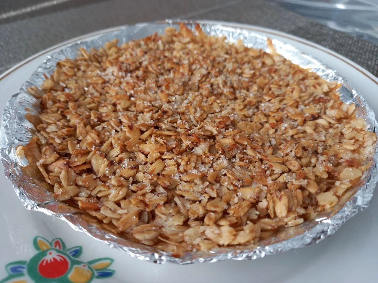 🔶Сухую овсянку смешиваем с оливковым маслом (по желанию можно перемолоть), выкладываем поверх яблок и посыпаем сахаром.