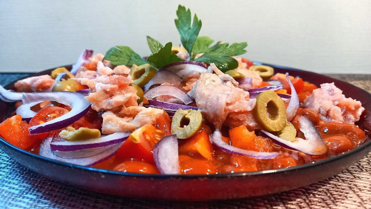 Поверх фасоли выложить измельченное филе тунца, резаный полукольцами лук. Оливки и помидоры черри (я разрезала на 4 части). Заправку салата составляет соус из фасоли.