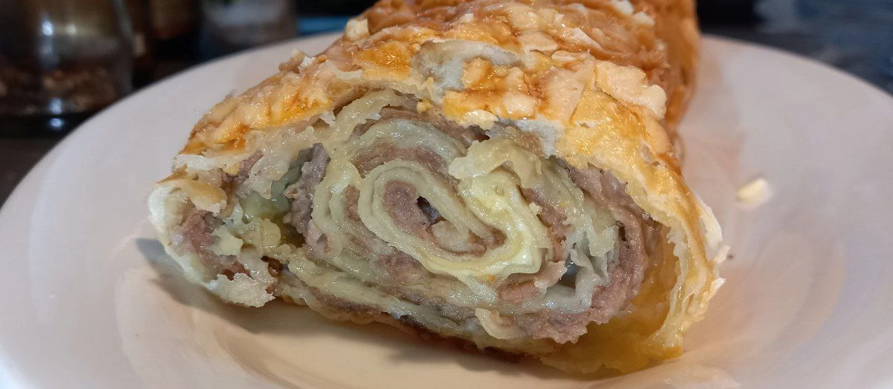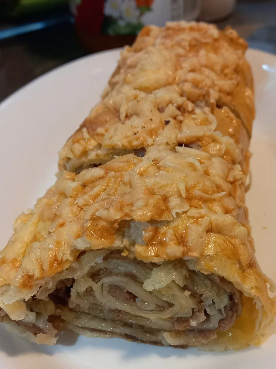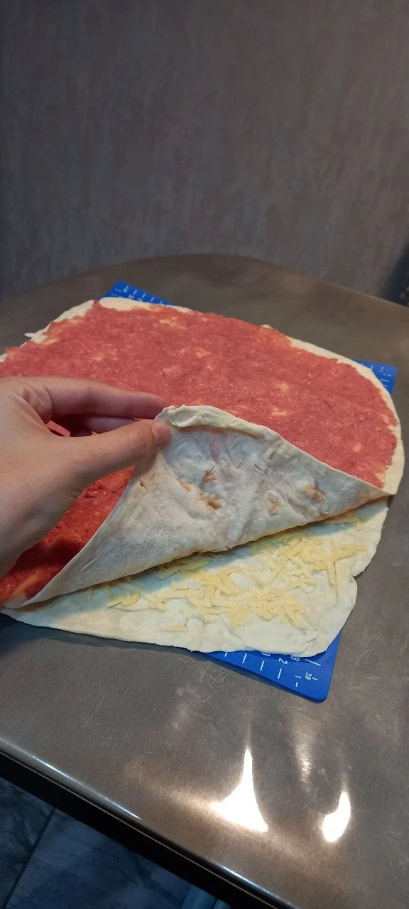 Яйцо смешиваем с фаршем, солим, перчим. Лаваш расстилаем, посыпаем тертым сыром. Кладем ещё один лаваш. Выкладываем начинку из фарша, сворачиваем в рулет.