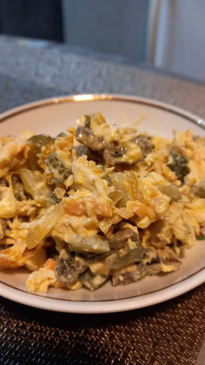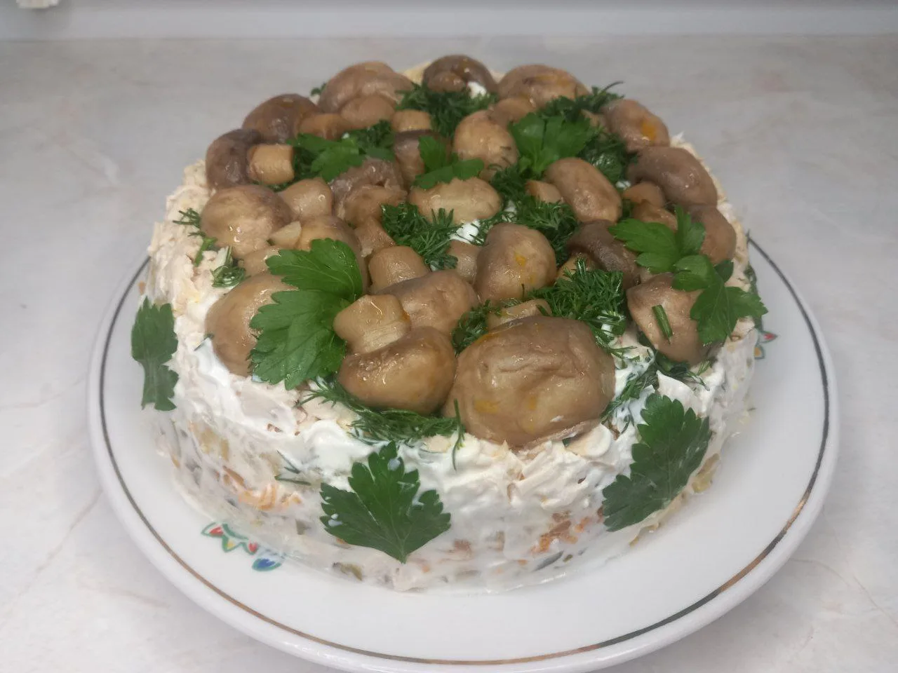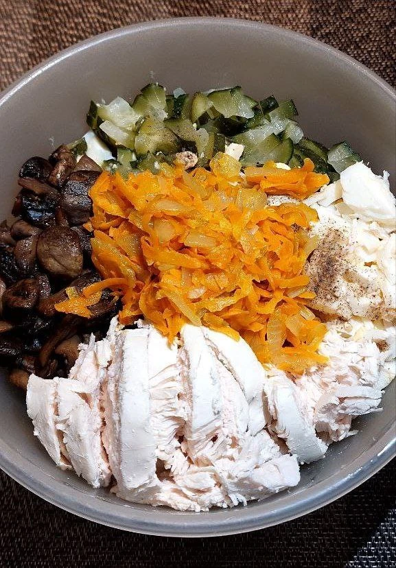 Куриное филе - лук с морковкой и грибами - яйца - орехи. Украсить солёными огурцами, маслинами и орехами.