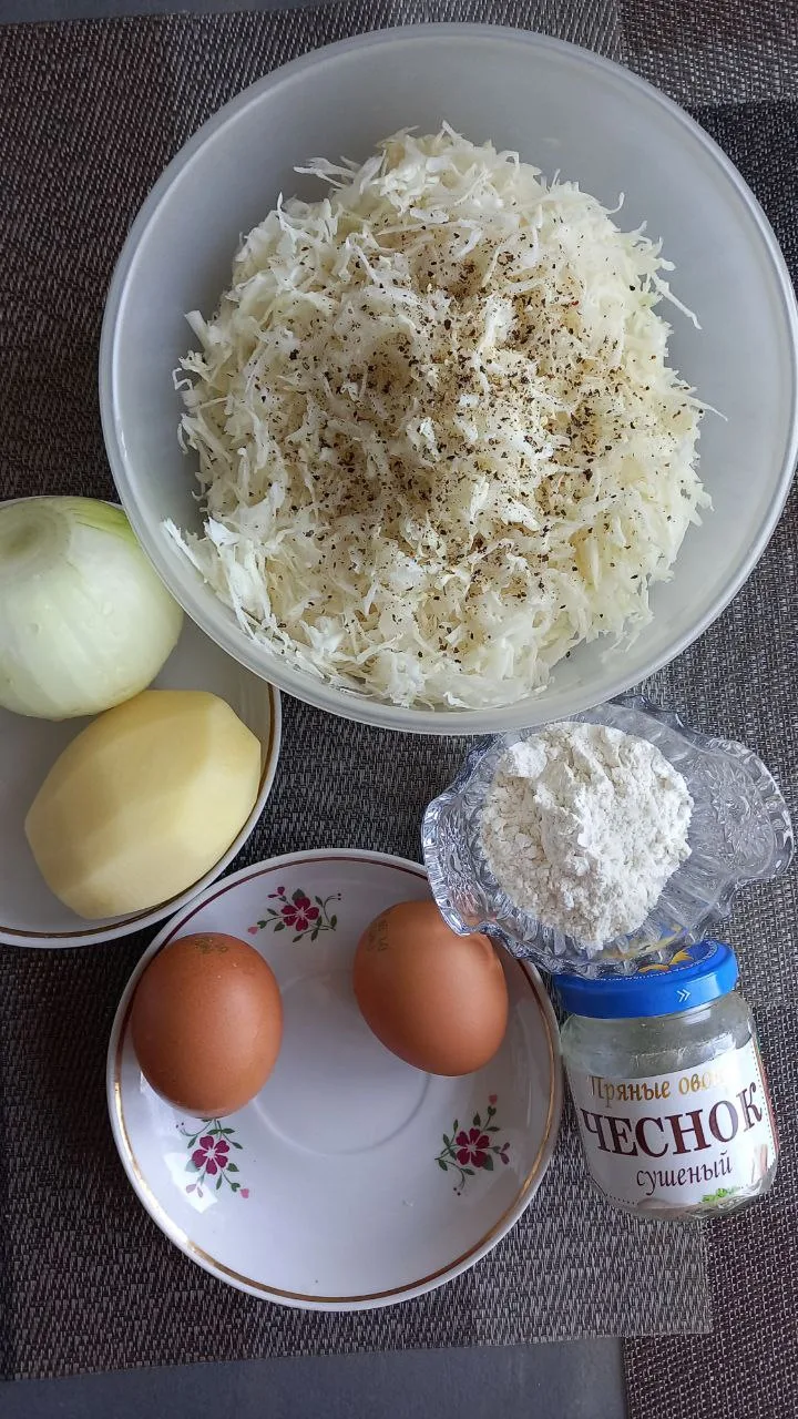 Шинкуем капусту, трём картофель на мелкой терке. Половину луковицы мелко нарезаем. Смешиваем все ингредиенты, добавляем муку, яйцо и специи. Перемешиваем и выкладываем на разогретую сковороду с маслом. Жарим под крышкой, на медленном огне с 2-х сторон, переворачиваем с помощью тарелки.
