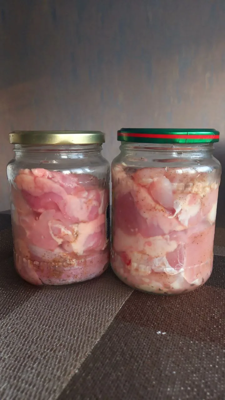 Солим и перчим мясо, на дно банки кладём по одному лавровому листику. Выкладываем мясо в банки, не полные до верха, оставляя 4-5 см. Накрыть крышкой, но НЕ плотно (просто положить сверху).