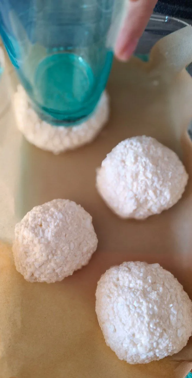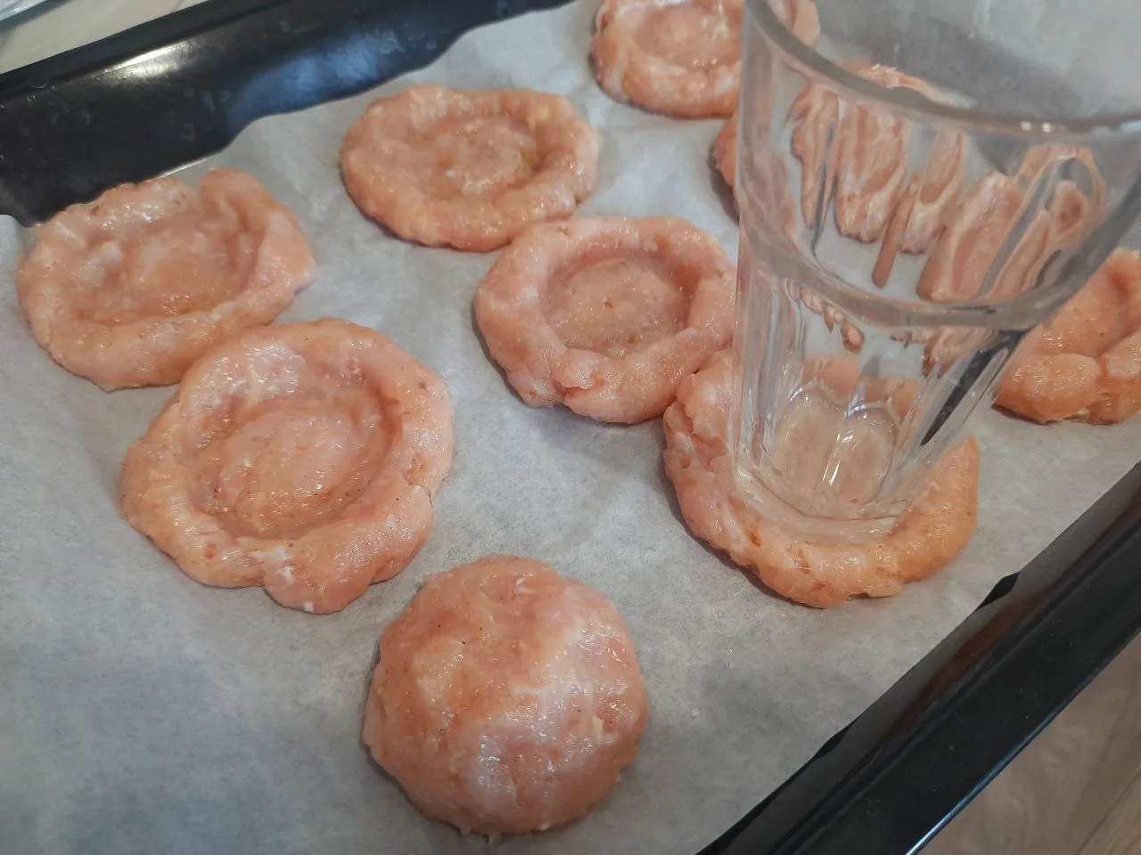В фарш я добавляем сухой чеснок, приправу для курицы, перец черный и соль. Перемешиваем хорошо. Выкладываем на пергамент кругляшки и придавливаем дном стакана.