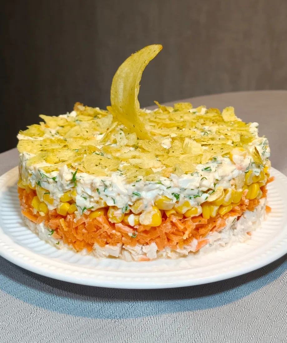 Подача: Мелко поломайте бОльшую часть чипсов и посыпьте ими верх салата. Оставшийся воткните вертикально, чтобы напоминал парус.