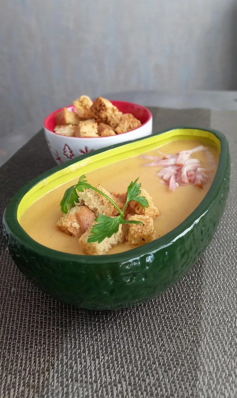 Соединяем горох с супом и пюрируем блендером. Ставим на плиту, доводим до кипения. Подаём с домашними сухариками.