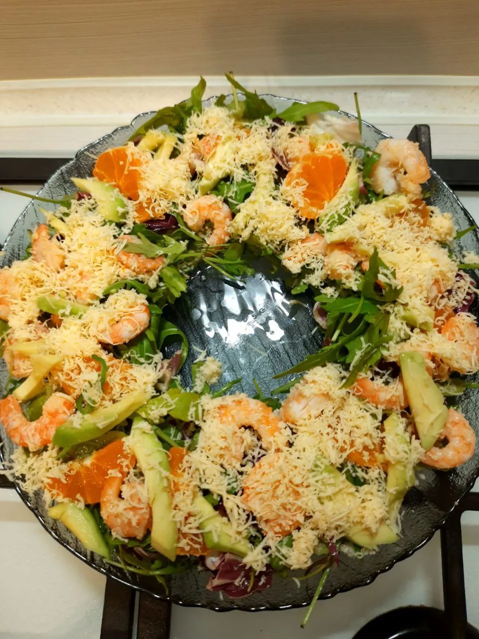 Оливковое масло 2ст.л., лимонный сок 1ст.л., мед 1ч.л., горчица 1/2ложки, щепотка соли. Креветки обжарить на сливочном масле с чесноком, выложить на блюдо все ингредиенты. У меня в виде новогоднего веночка, т.к. делала на новый год.
