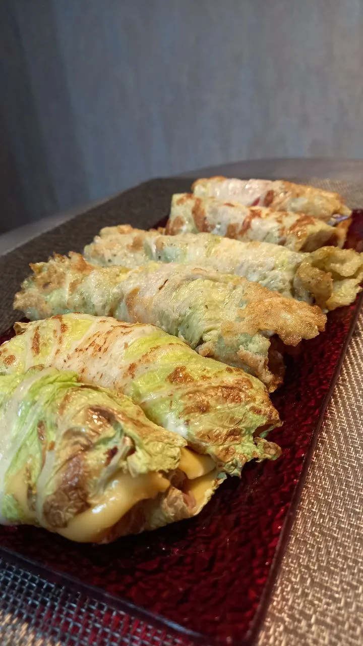 С листьев пекинской капусты срезаем грубую часть листа (не полностью) оставшуюся часть отбиваем молоточком.