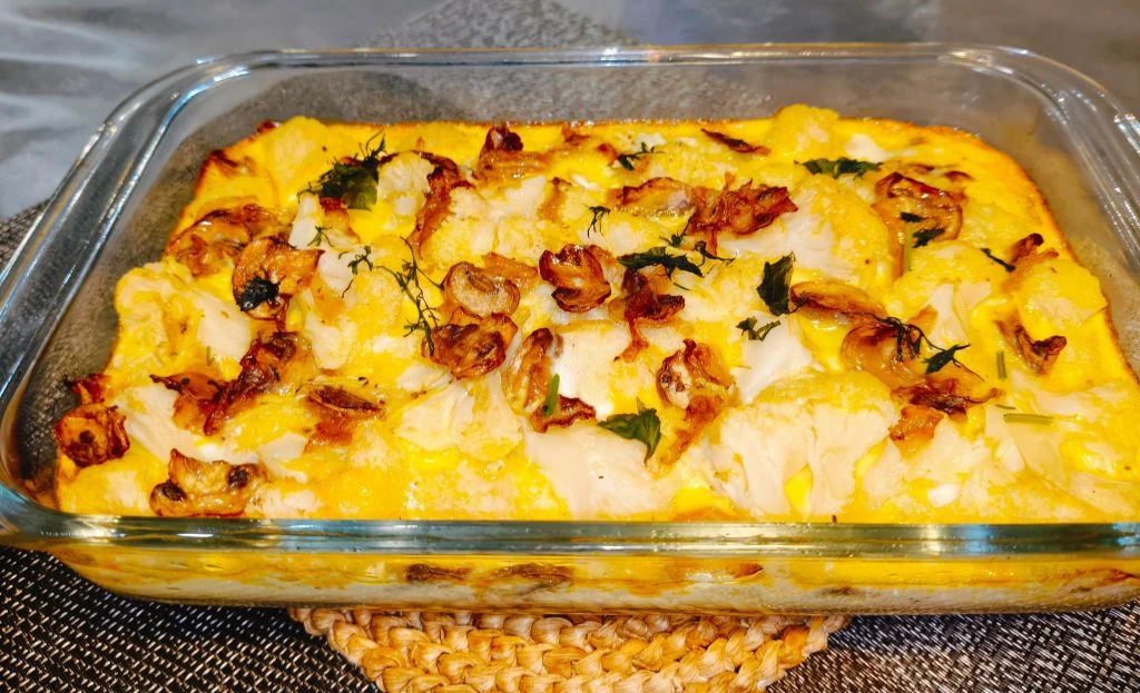 Грибы и лук обжариваем на сковороде. Капусту цветную отвариваем около 5 минут. Смешиваем молоко, яйца, соль, черный молотый перец и чеснок на мелкую терку. Выкладываем в форму, смазанную маслом, капусту, грибы, заливаем заливкой, отправляем в духовку на 180 градусов на 30 минут.