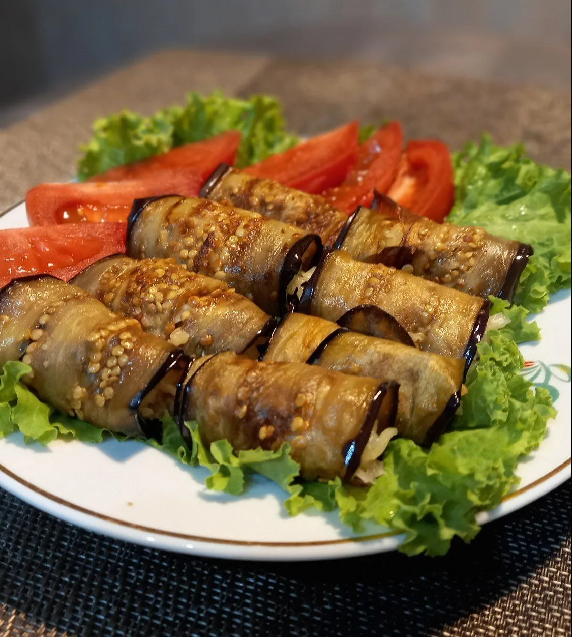 🔸 Выкладываем начинку на баклажаны, сворачиваем рулетиками, укладываем на листья салата, посыпаем зеленью.