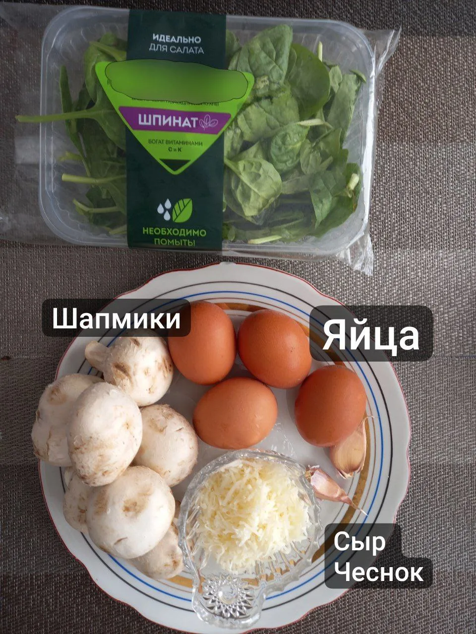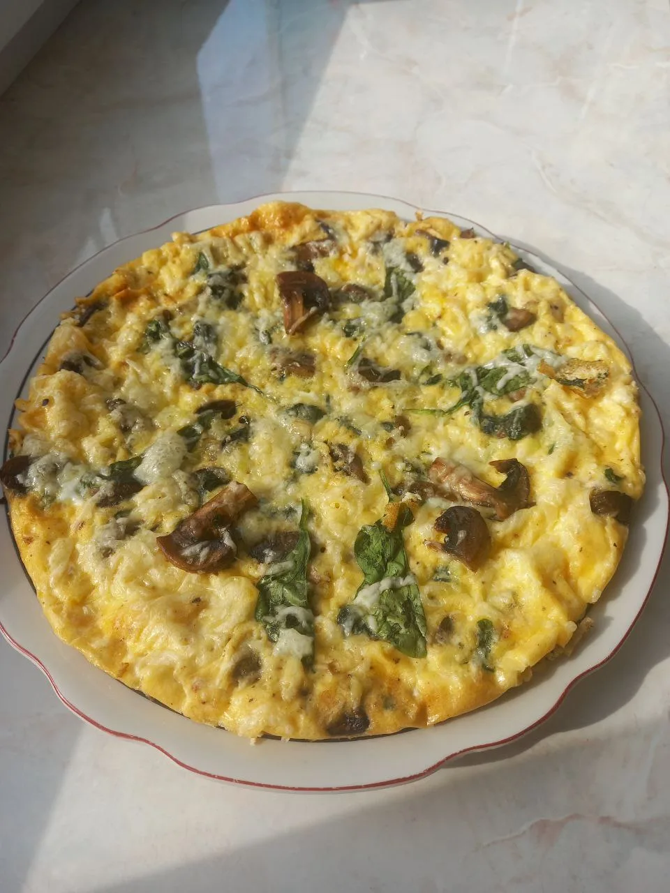 В большой миске, взбиваем яйца, добавляем соль, перец, половину пармезана, обжареные грибы и шпинат. Хорошо перемешиваем.
