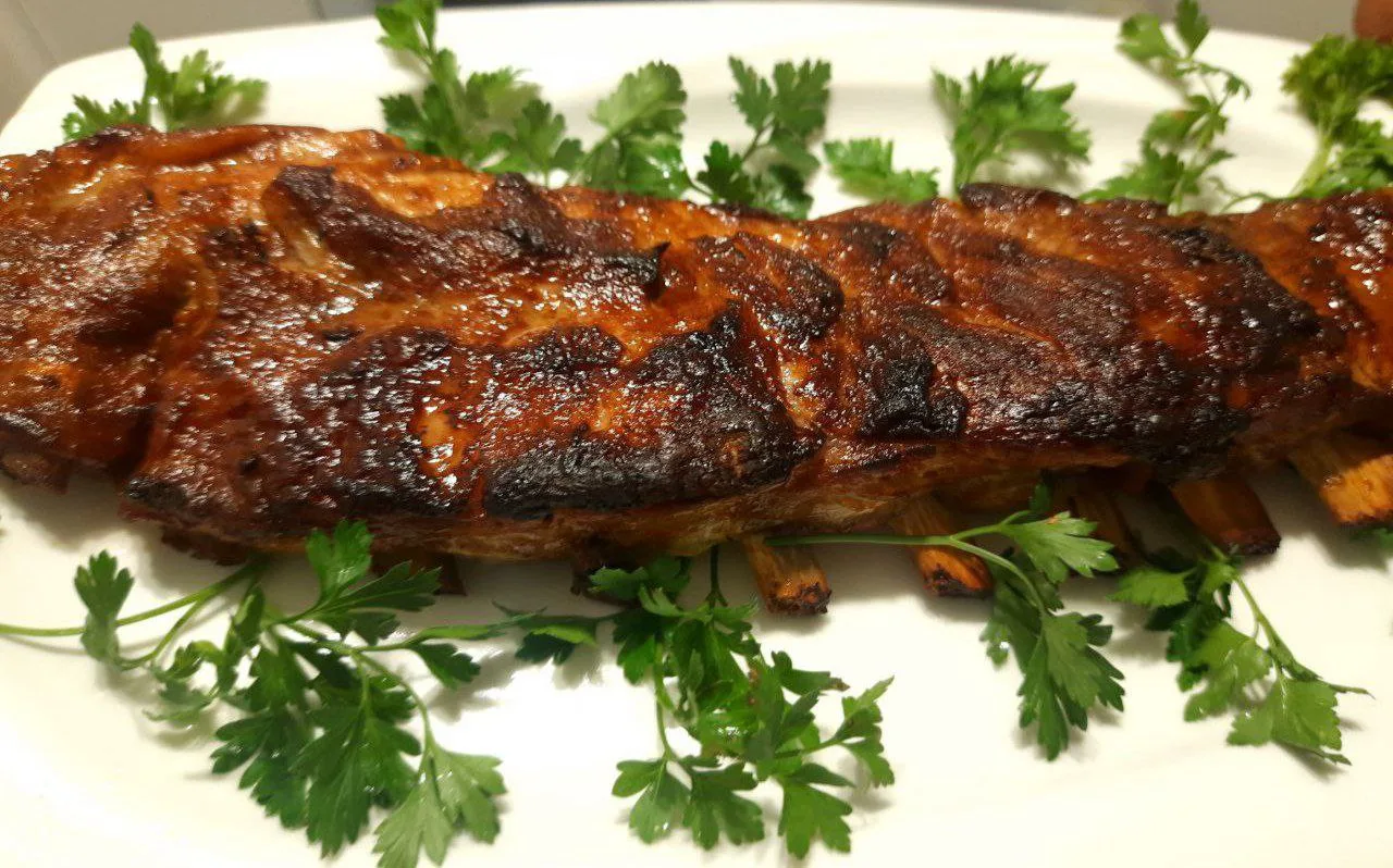 Мелко нарезаем зелень петрушки и мелко рубим несколько зубчиков чеснока. Заполняем этой смесью надрезы на голени и посыпаем приправой для курицы. Смешиваем соевый соус, немного мед и хорошенько все перемешиваем. А затем заливаем этим маринадом голень и оставляем на несколько часов, можно на ночь. #мясо