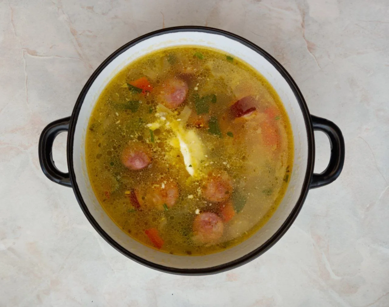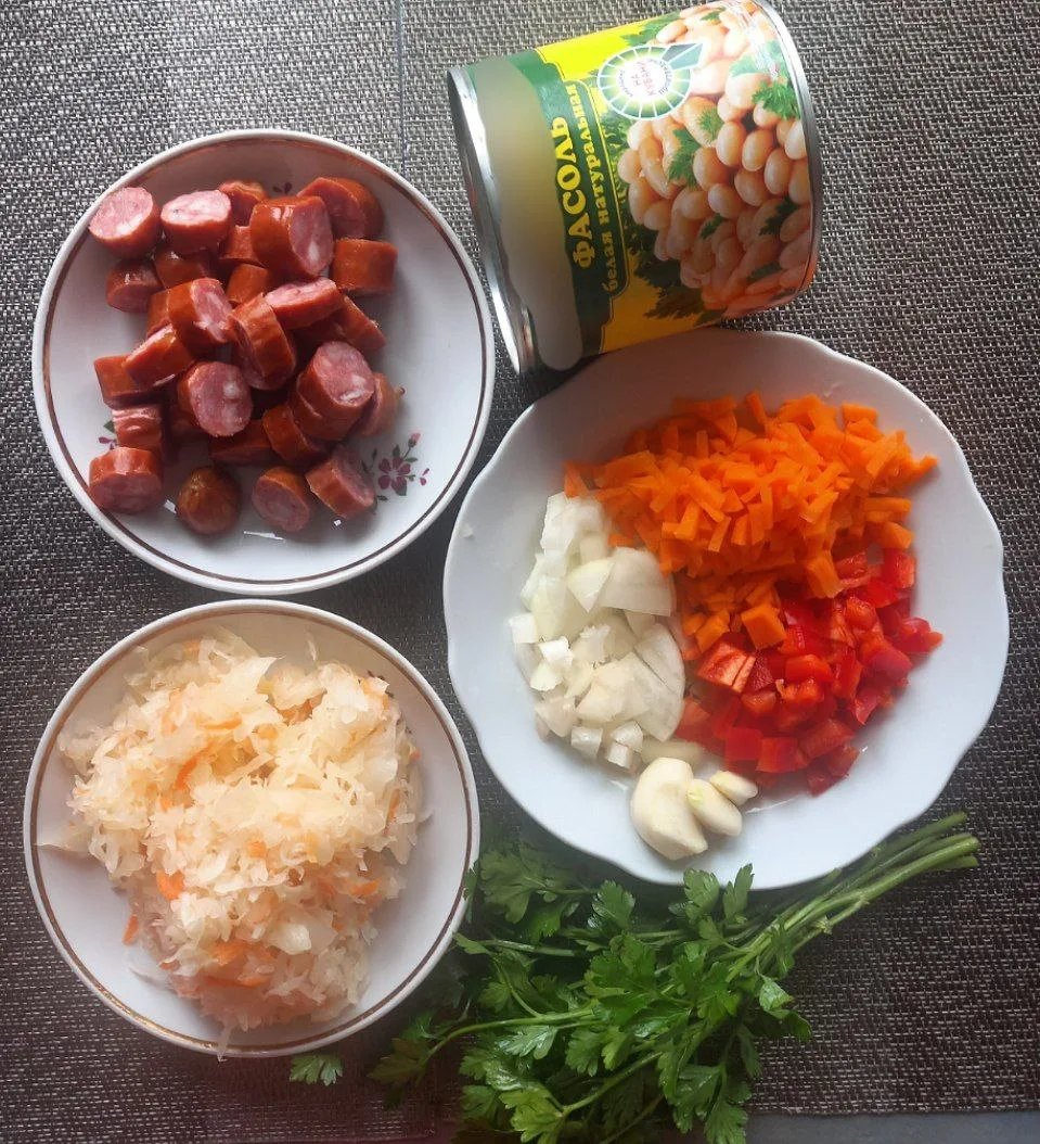 В кипящий бульон кладем нарезанный картофель и варим минут 15. На сковороде на растительном масле обжариваем колбаски до румяности. Добавляем к картофелю капусту и варим 10 минут. Добавляем промытую фасоль, колбаски. Делаем зажарку из лука, моркови, перца болгарского, чеснока. Добавляем в зажарку щепотку сахара, соль. Выкладываем в суп, добавляем зелень, кипятим, выключаем.