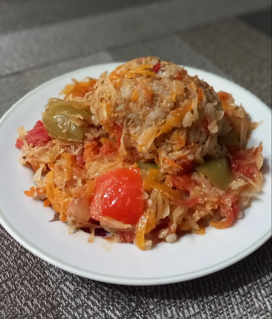 Далее сверху выкладываем небольшие (у меня большие, мне было лень)😂 тефтельки и тушим на среднем огне, под крышкой 20 минут.