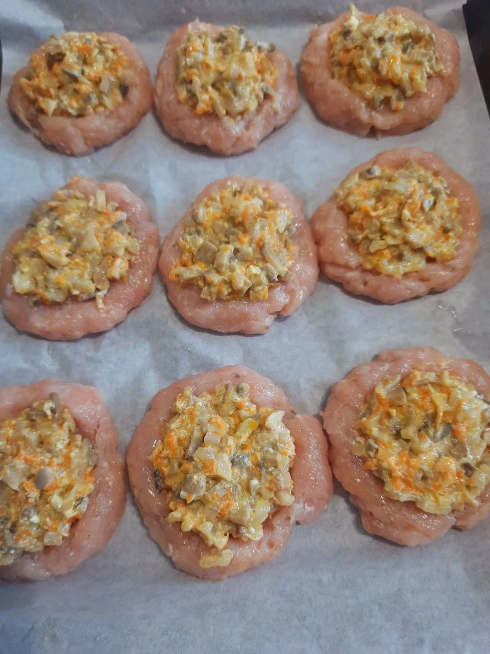 На сковороде обжариваем лук, морковь с грибами, кладем туда пару столовых ложки сметаны, сливок или майонеза. Выкладываем на фарш начинку и запекаем минут 10-15.