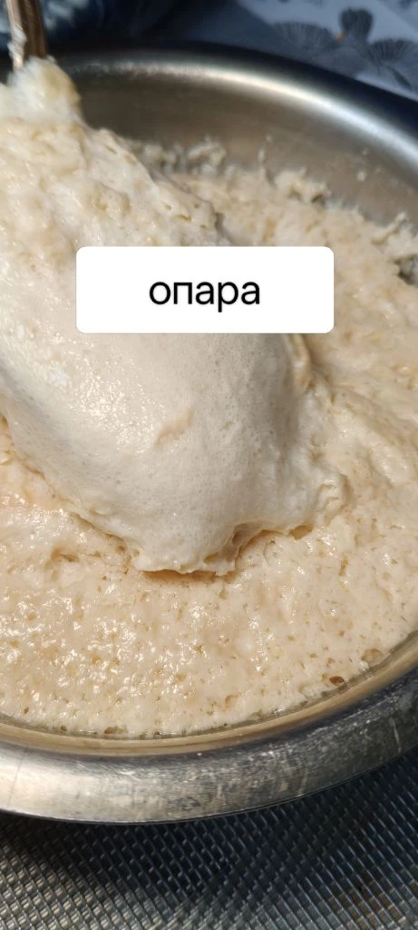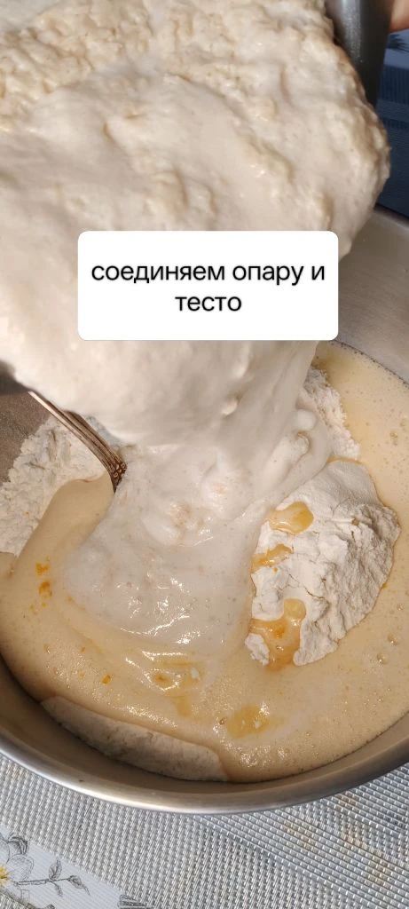 4. В тесто вливаем опару, перемешиваем. Духовку нагреваем до 50°, выключаем и ставим тесто (или просто в теплое место) на 30 минут.