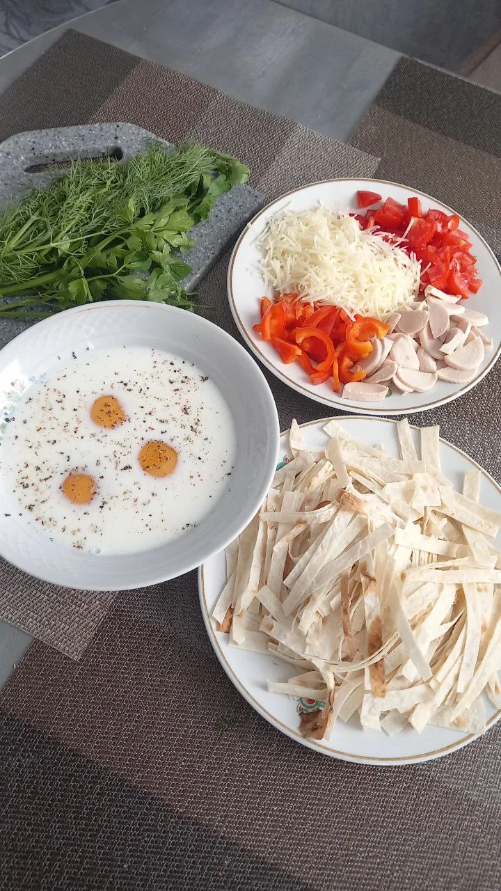 📌 Колбасу, зелень, помидор нарезать на мелкие кусочки. Сыр натереть. Смешать начинку. Уложить в лаваш и свернуть конвертиком.