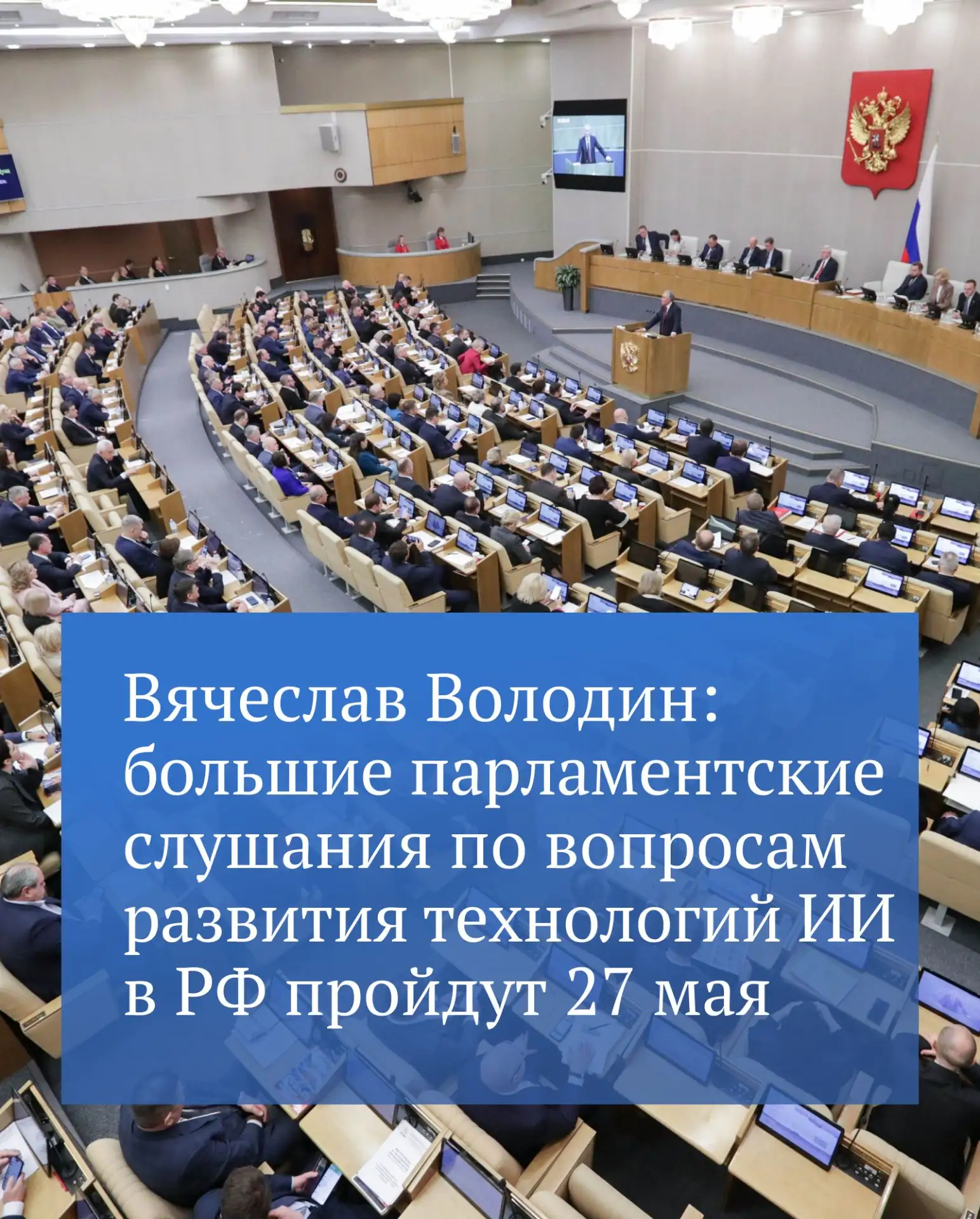 По решению Совета Государственной Думы парламентские слушания по вопросам развития технологий искусственного интеллекта в России пройдут 27 мая, сообщил Председатель ГД Вячеслав Володин.