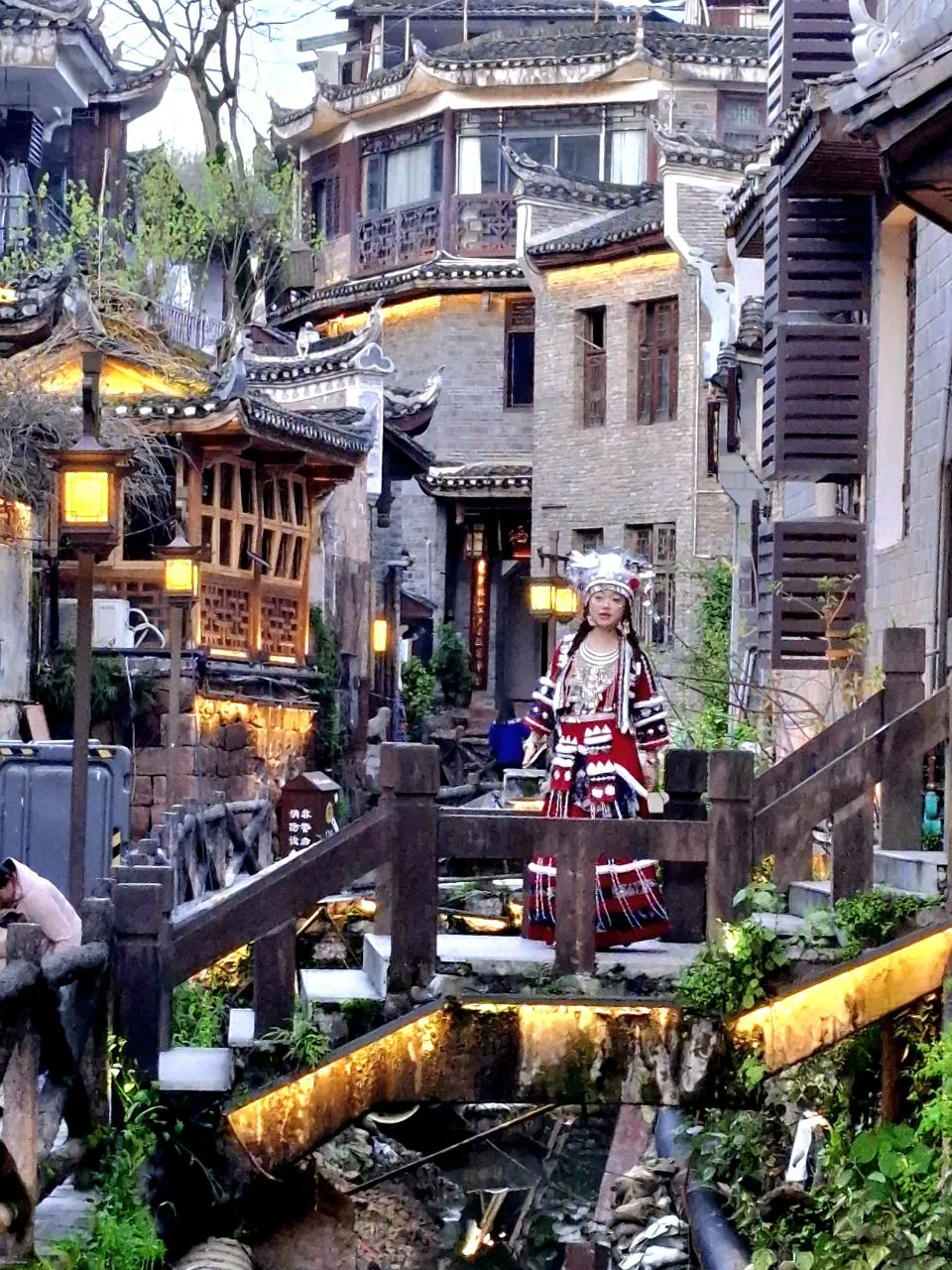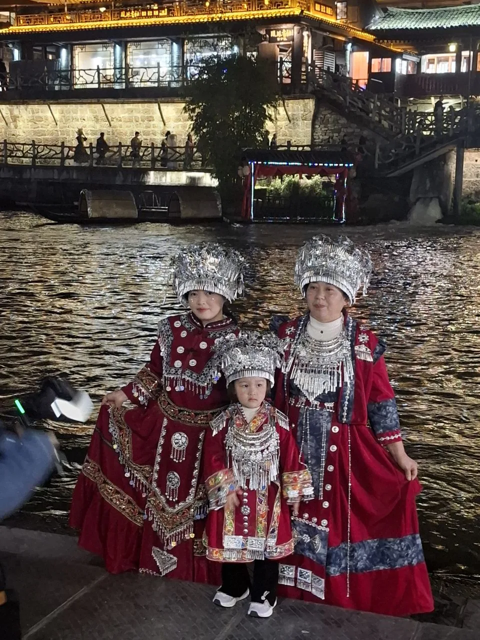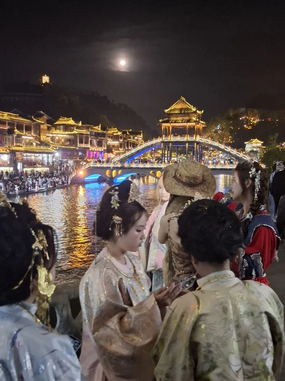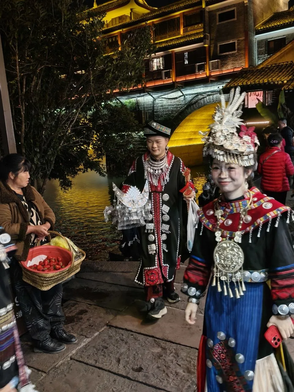 #китай #Азия Атмосфера вечернего Фэнхуана - 8-й кадр. 😂🔥 Вчера было так же. Им не важно - выходной, не выходной. Нарядились и тусят. В городе полно прокатов костюмов народов туцзя и мяо. Там же делают причёски, макияж.