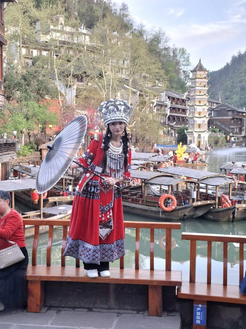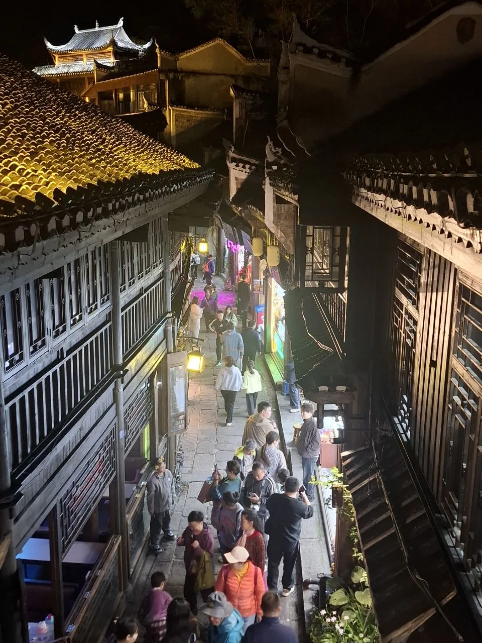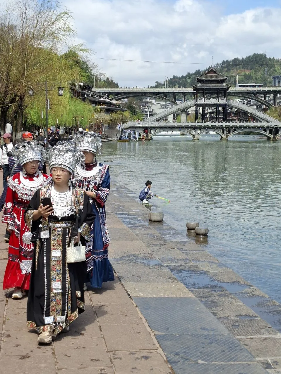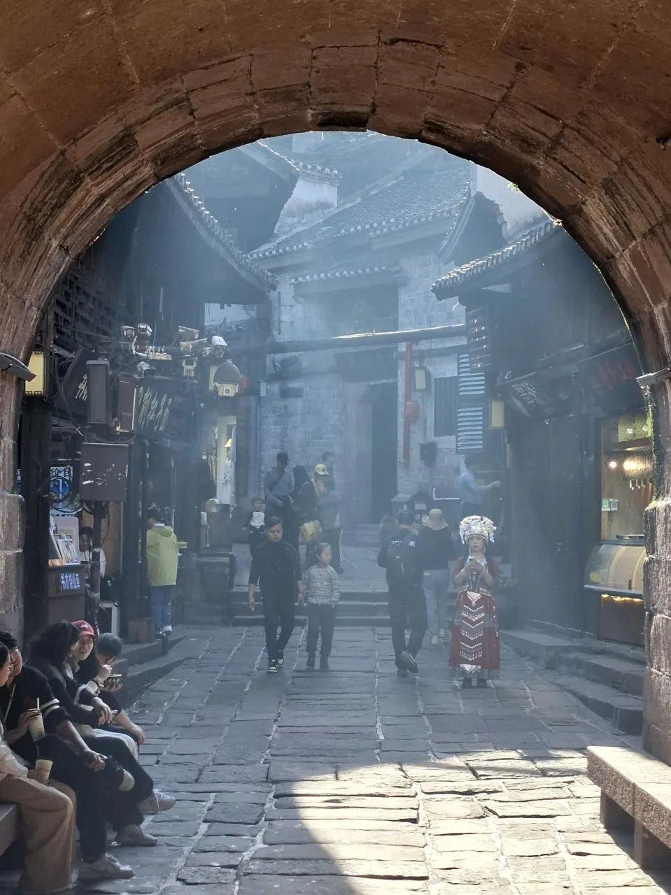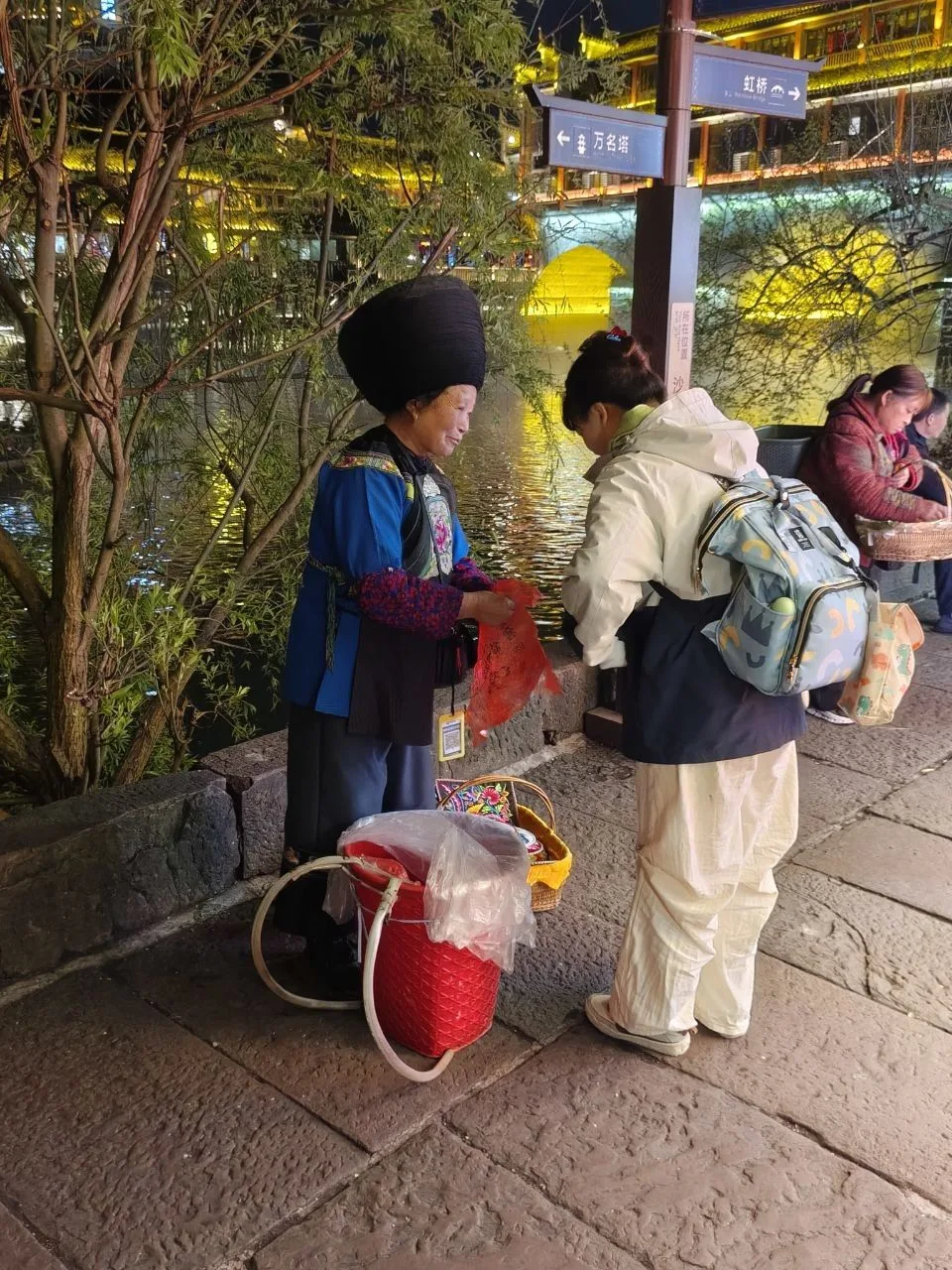 #китай #Азия Атмосфера вечернего Фэнхуана - 8-й кадр. 😂🔥 Вчера было так же. Им не важно - выходной, не выходной. Нарядились и тусят. В городе полно прокатов костюмов народов туцзя и мяо. Там же делают причёски, макияж.