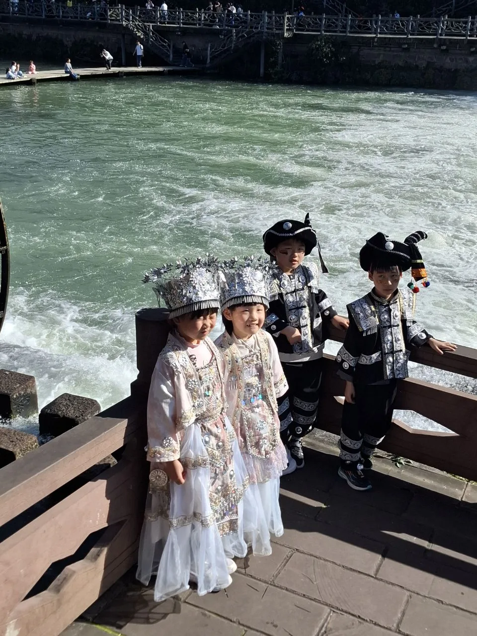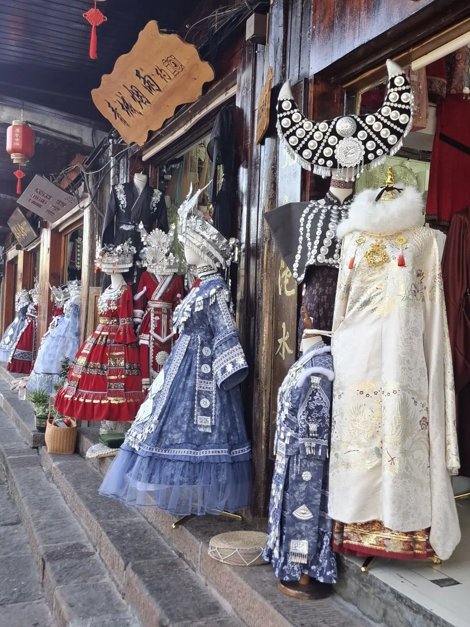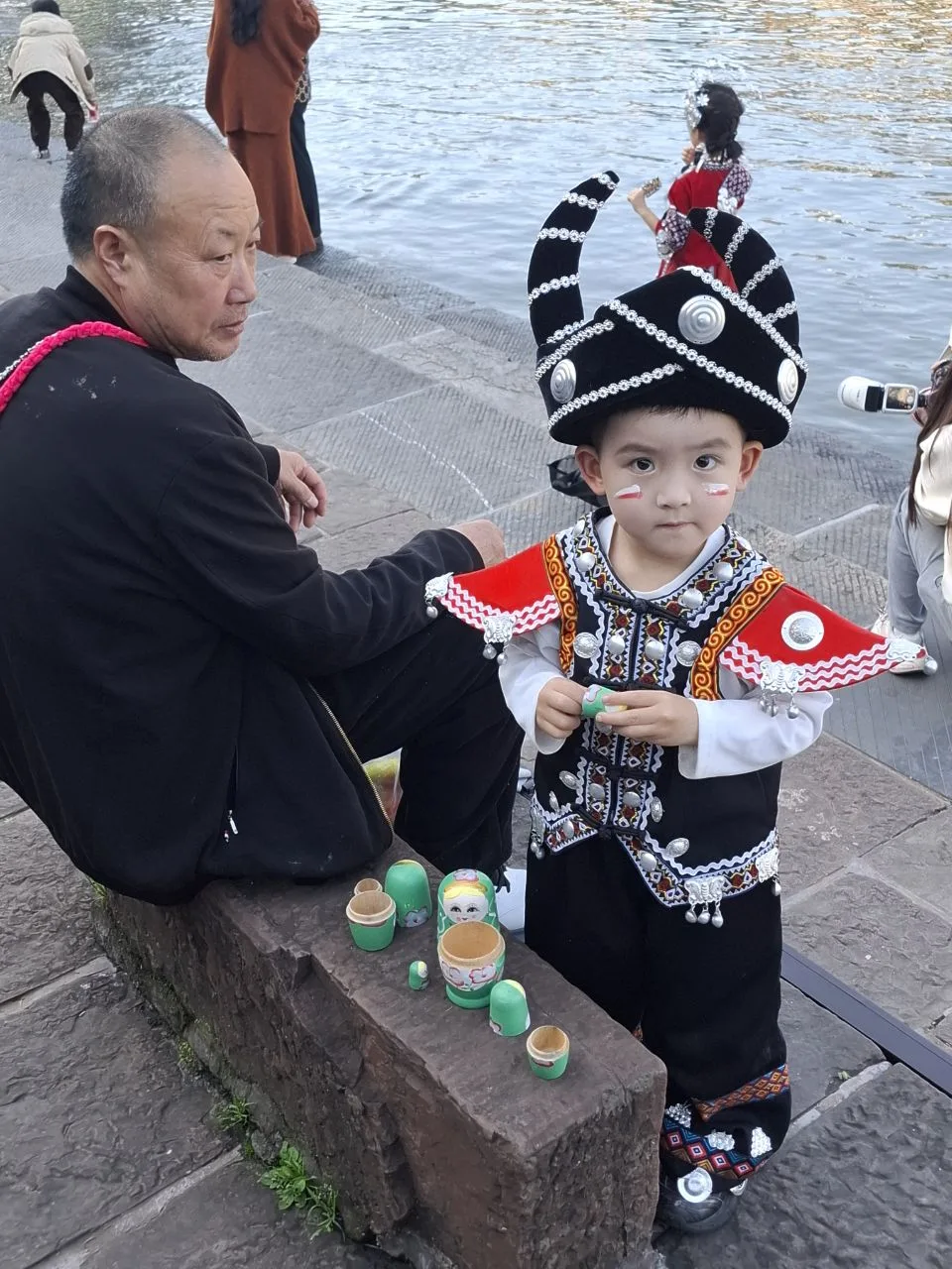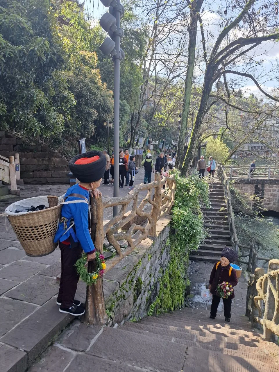 #китай #Азия Атмосфера вечернего Фэнхуана - 8-й кадр. 😂🔥 Вчера было так же. Им не важно - выходной, не выходной. Нарядились и тусят. В городе полно прокатов костюмов народов туцзя и мяо. Там же делают причёски, макияж.