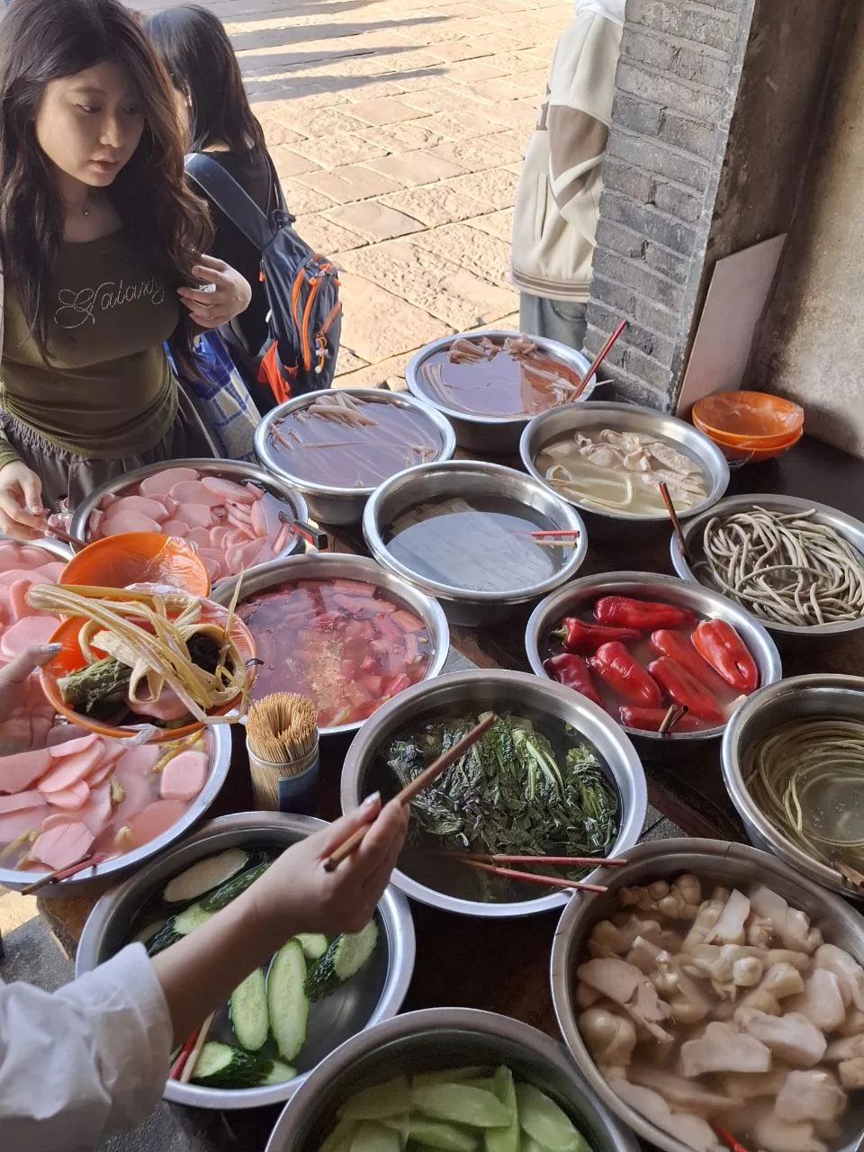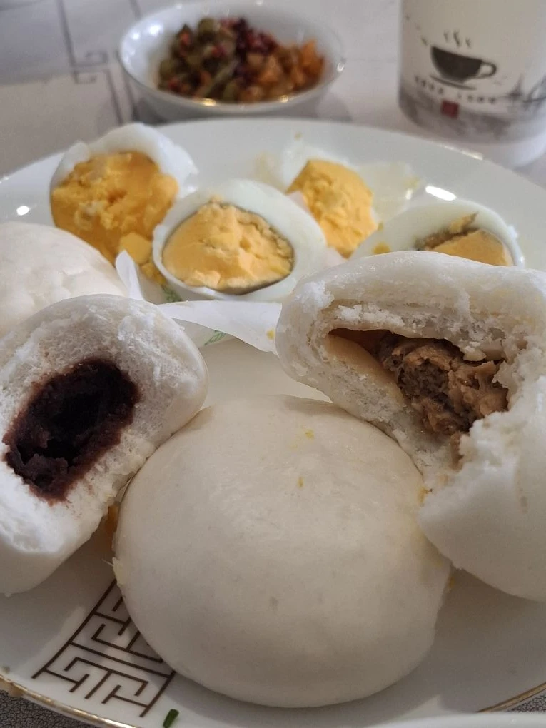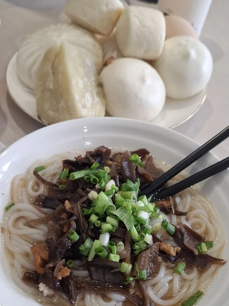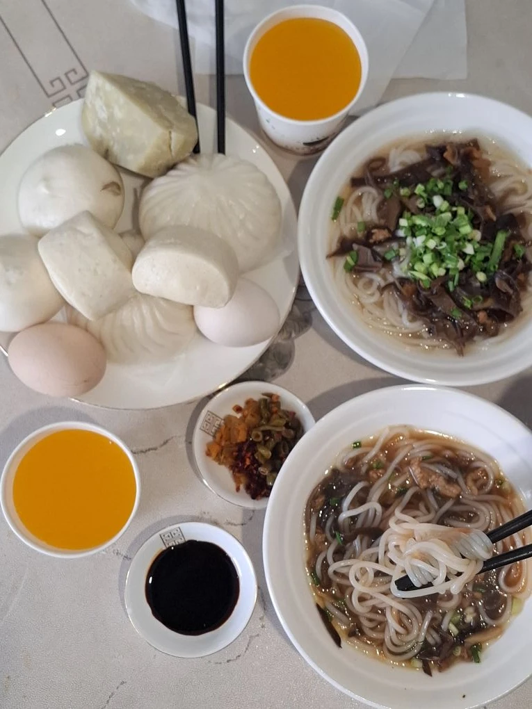 📍Фэнхуан. Завтрак был вкусным. Лапша с грибами и зеленью (не острая), куча каких-то пирожков (мясных и сладких), варёные яйца, батат, апельсиновый сок (почему-то горячий). Ещё была рисовая каша и молоко. А потом хозяйка отеля начала нам расписывать местные достопримечательности и наш сегодняшний маршрут. #китай #Азия