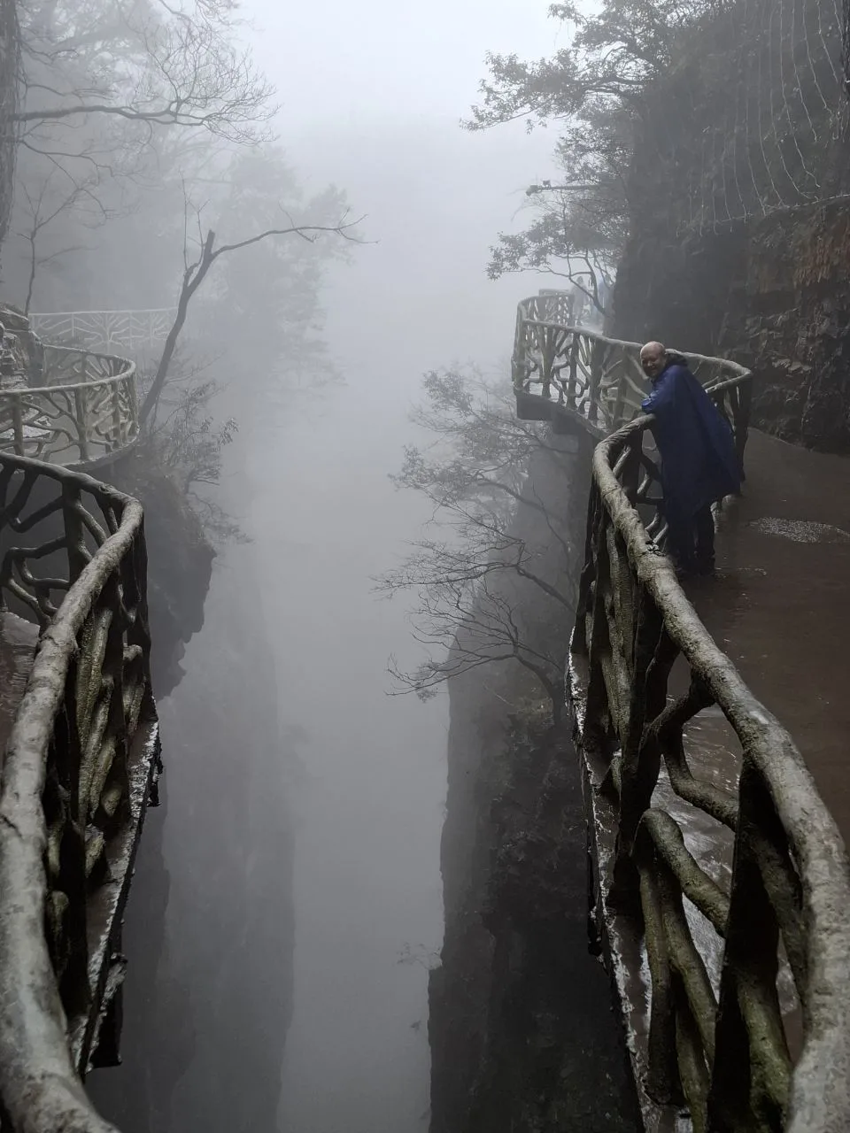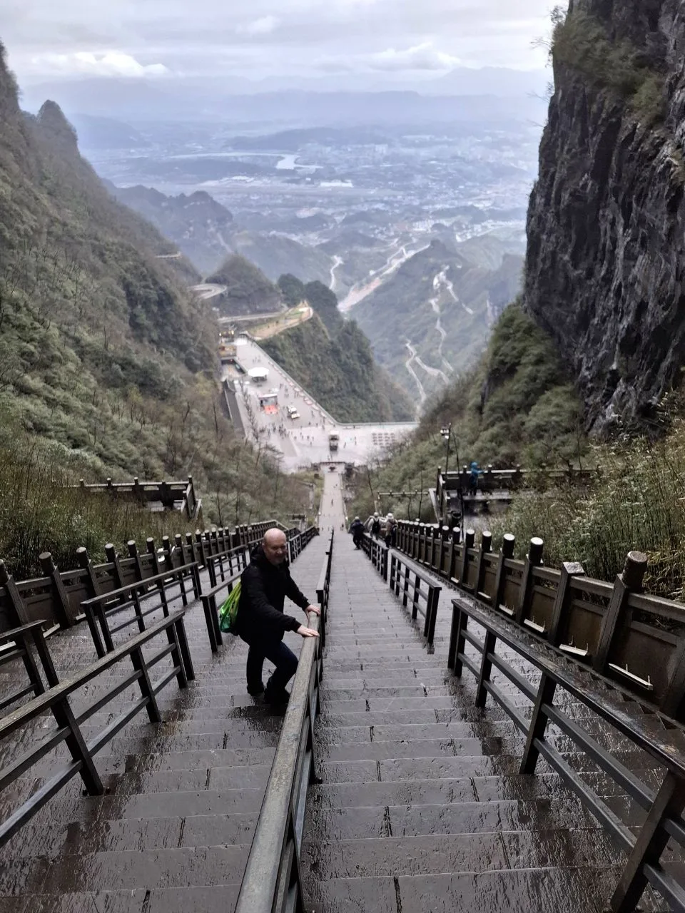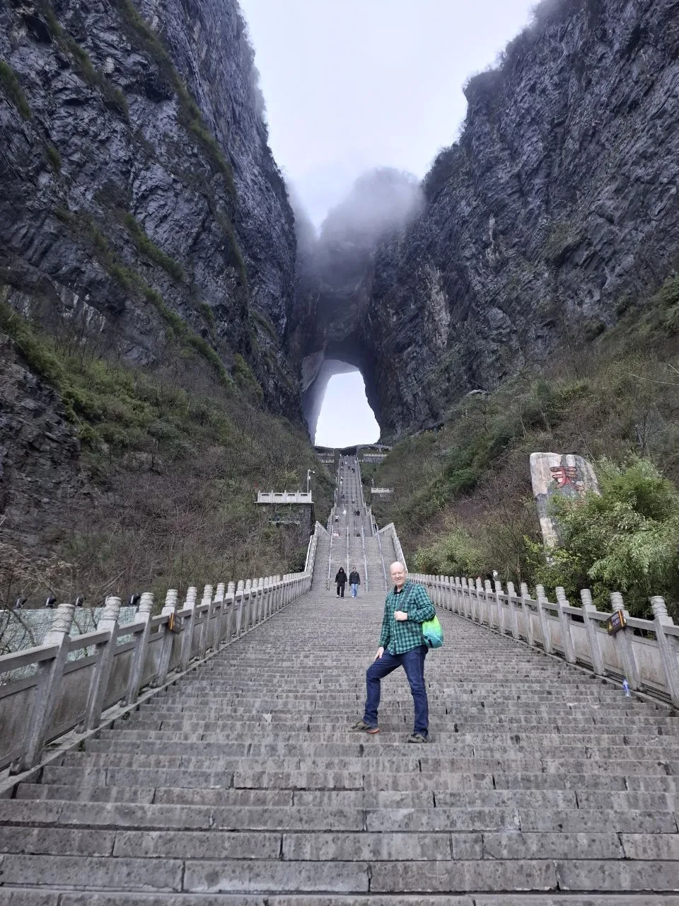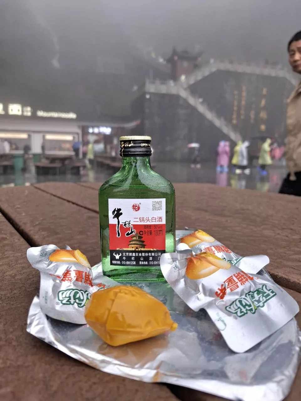 📍Тяньмэнь (кит. 天门山). Приехали утром к Небесным вратам - гигантской арке и ведущей к ней лестнице. А тут дождь, облака, нулевая видимость. Пришлось купить 56-градусного горного вина и запеченных яиц. 🥳🔥 И то, и другое 10 из 10. Ждём, когда выглянет солнце...