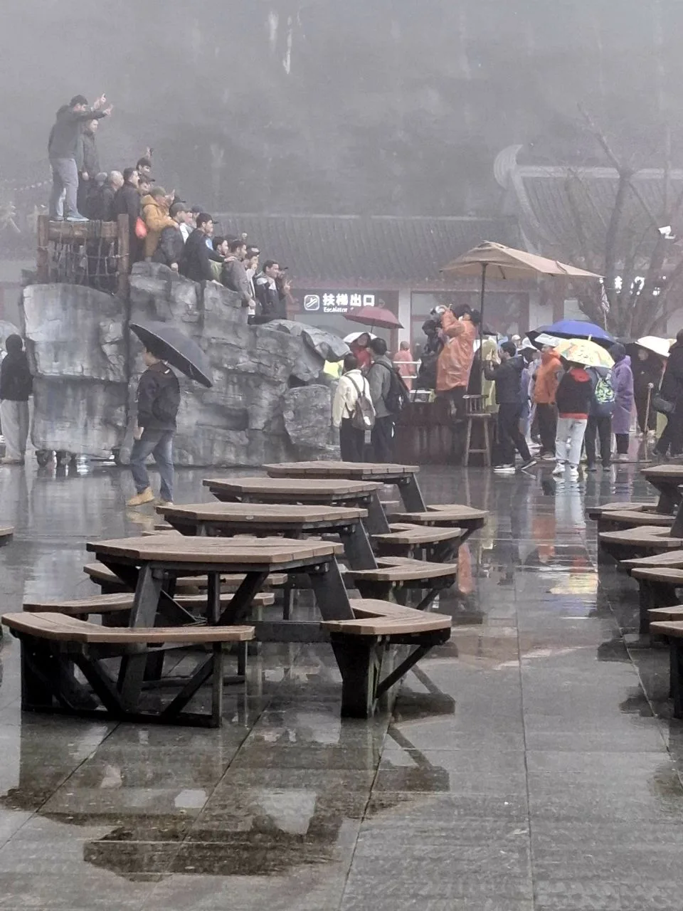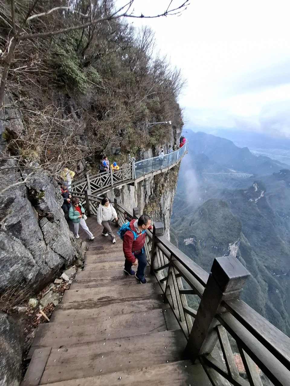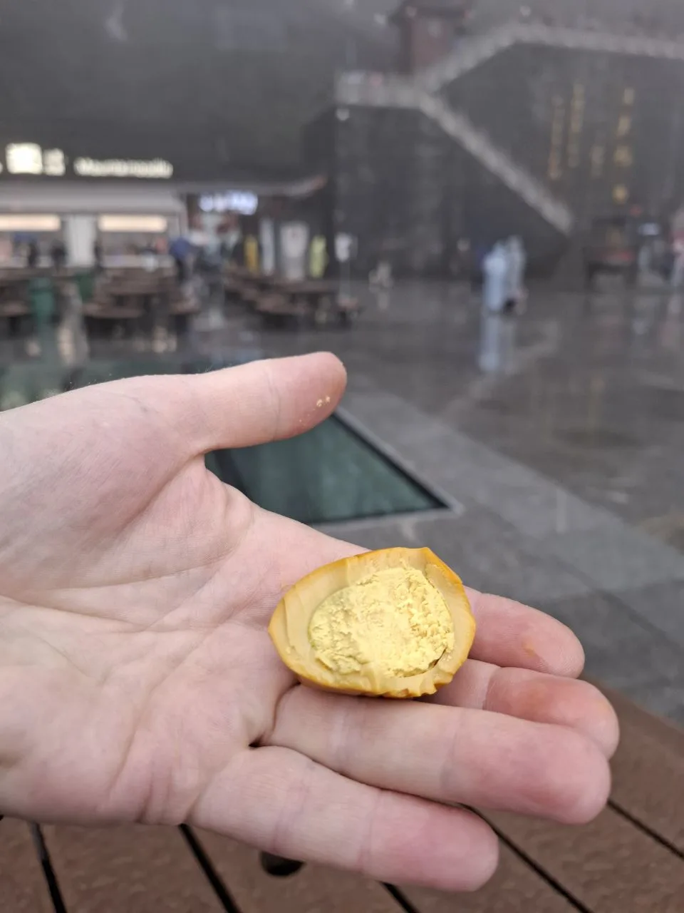 📍Тяньмэнь (кит. 天门山). Приехали утром к Небесным вратам - гигантской арке и ведущей к ней лестнице. А тут дождь, облака, нулевая видимость. Пришлось купить 56-градусного горного вина и запеченных яиц. 🥳🔥 И то, и другое 10 из 10. Ждём, когда выглянет солнце...