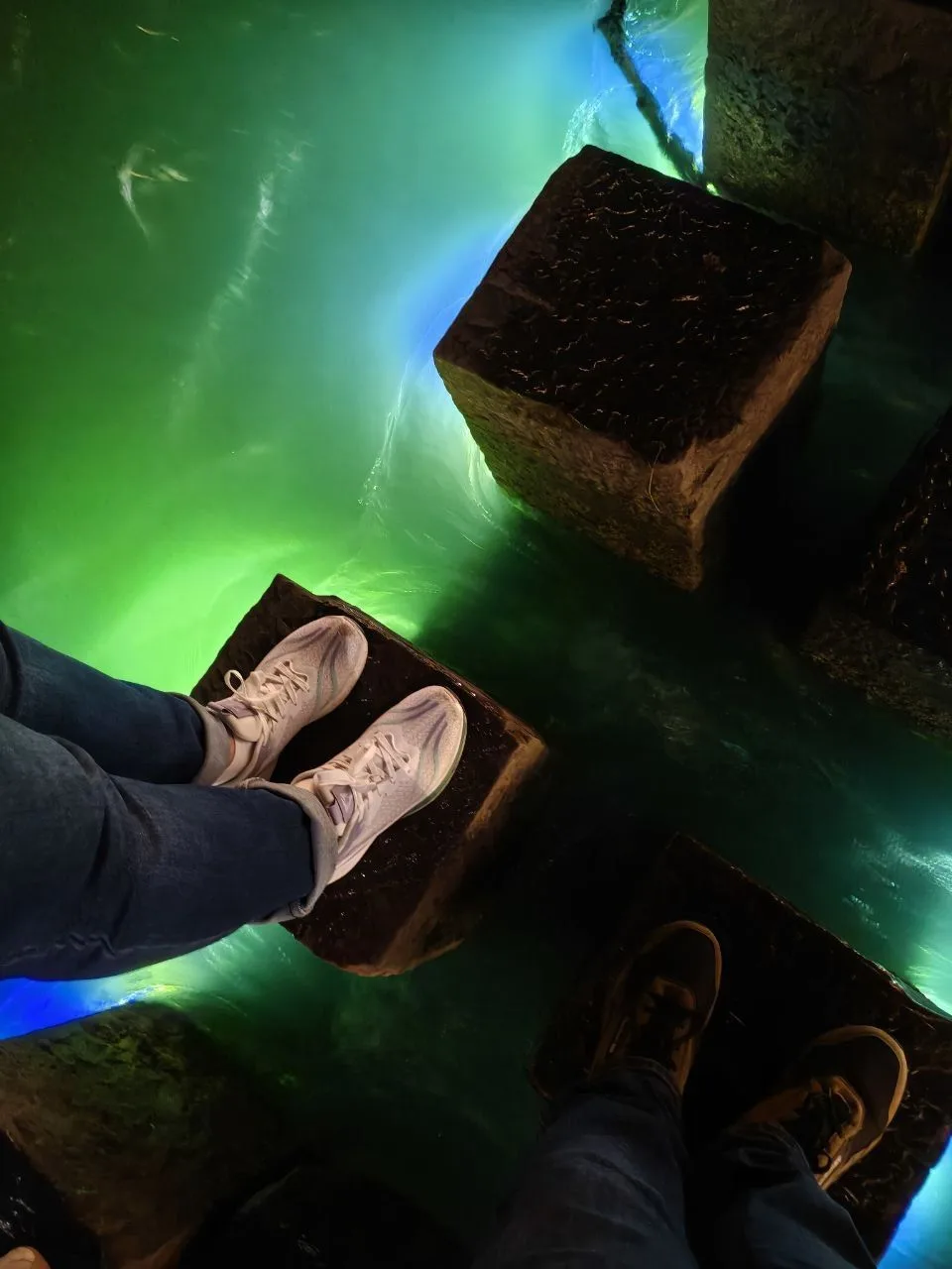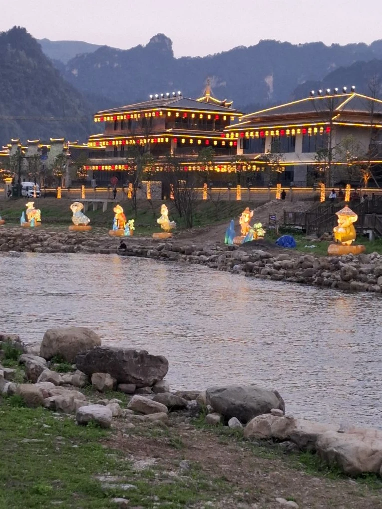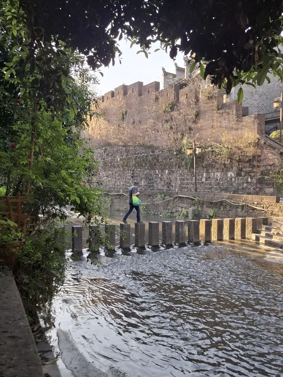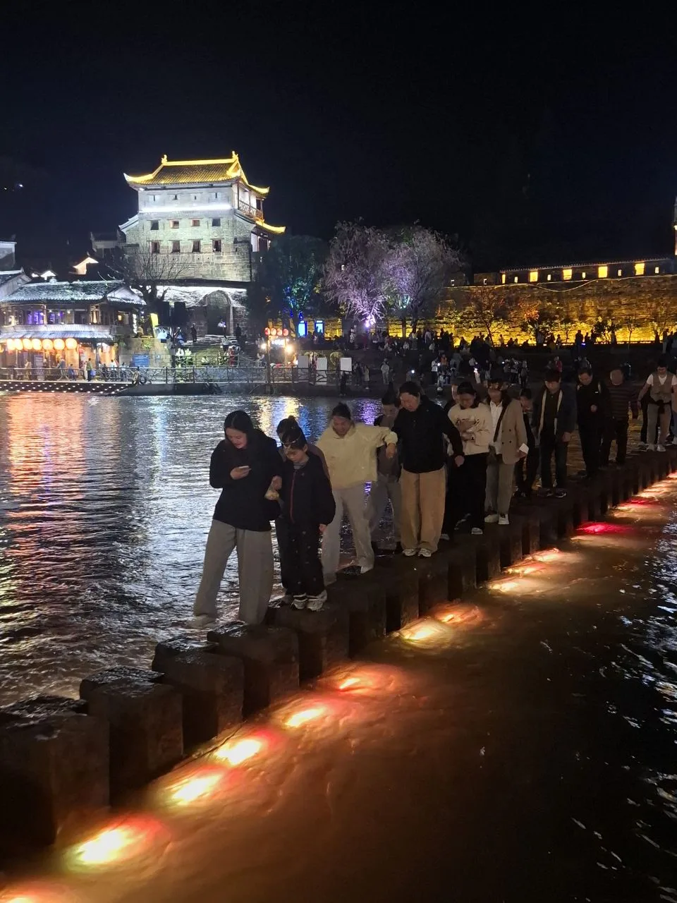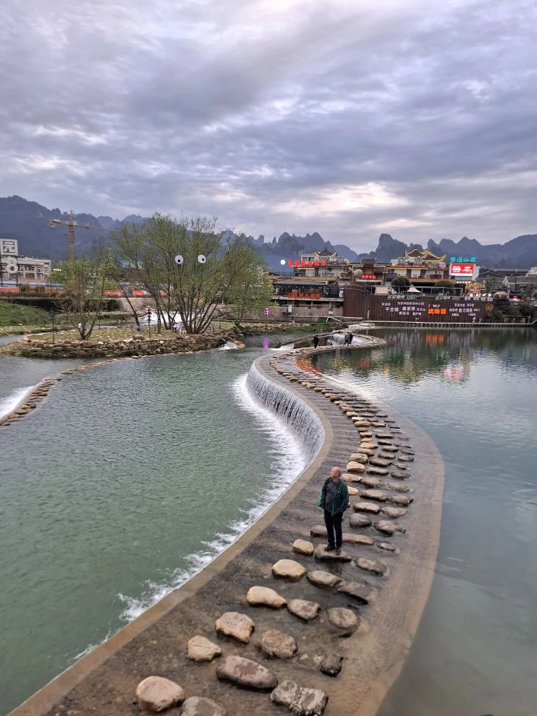 Днём проход был закрыт, открыли вечером. Второе фото даёт представление, как работает этот аттракцион. Сначала идёшь на другой берег по деревянным мосткам, а потом обратно - по этим камням. Мы прошли! 🥳👌 #Китай #Азия