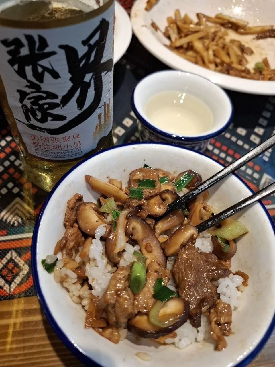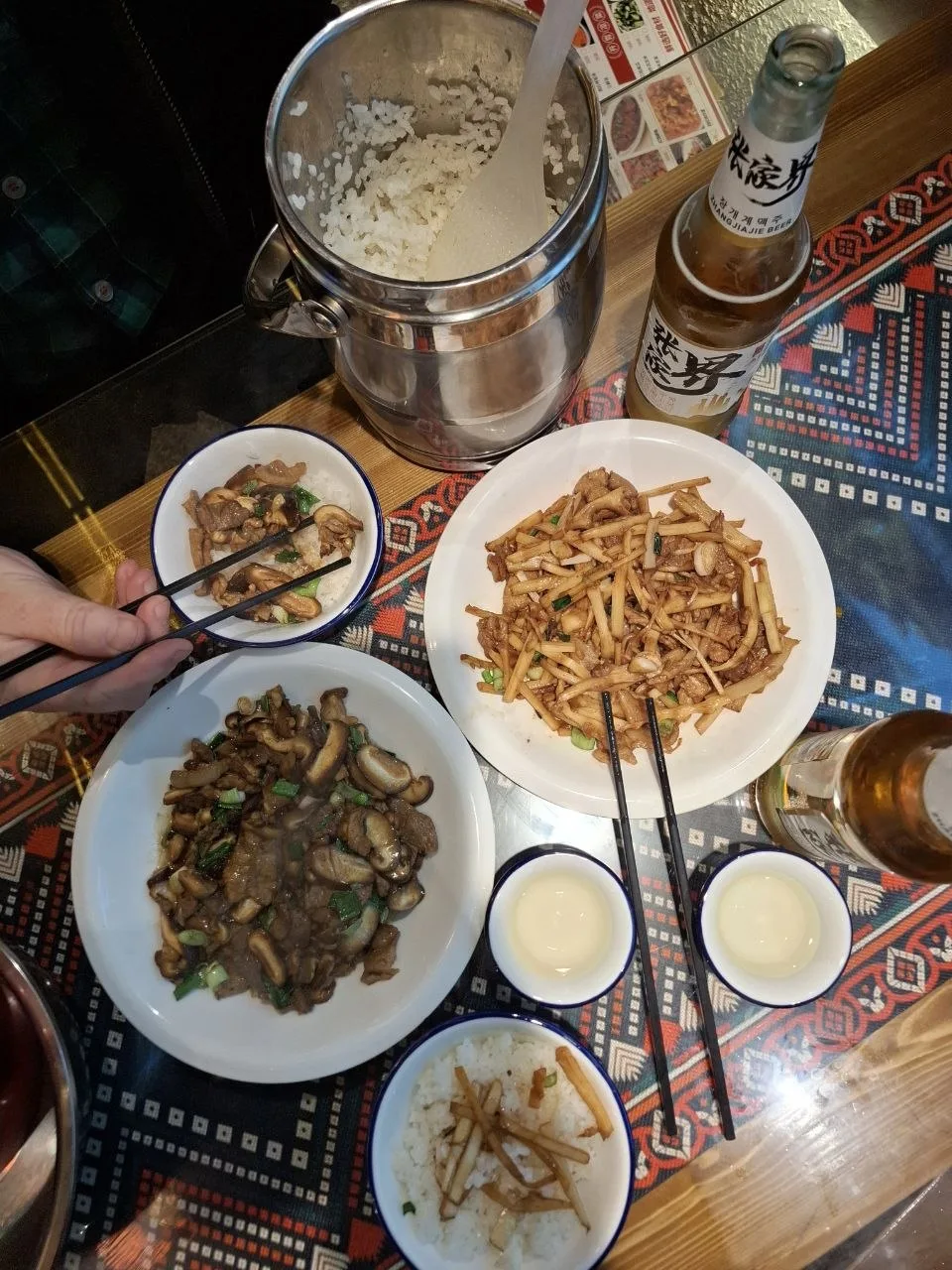 📍Чжанцзяцзе. Вечер выдался дождливым, но очень вкусным. Ели свинину с бамбуком и свинину с грибами. Рис в качестве гарнира принесли в металлическом ведре, стоил 24 рубля. Весь ужин вместе с пивом обошёлся в 1200 р.