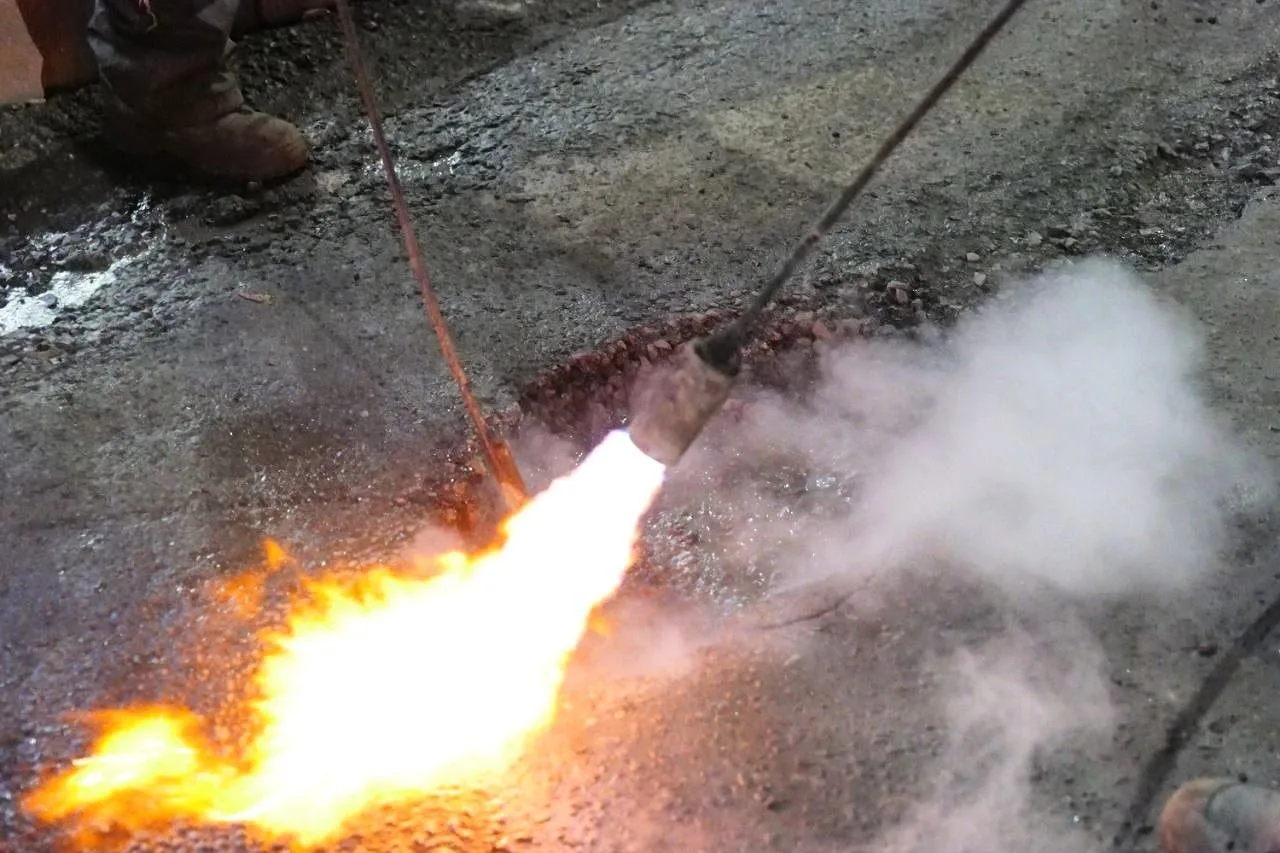 Продолжаем ямочный ремонт кемеровских дорог литой асфальтобетонной смесью