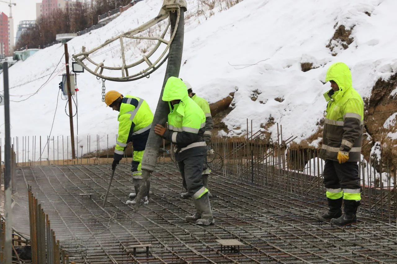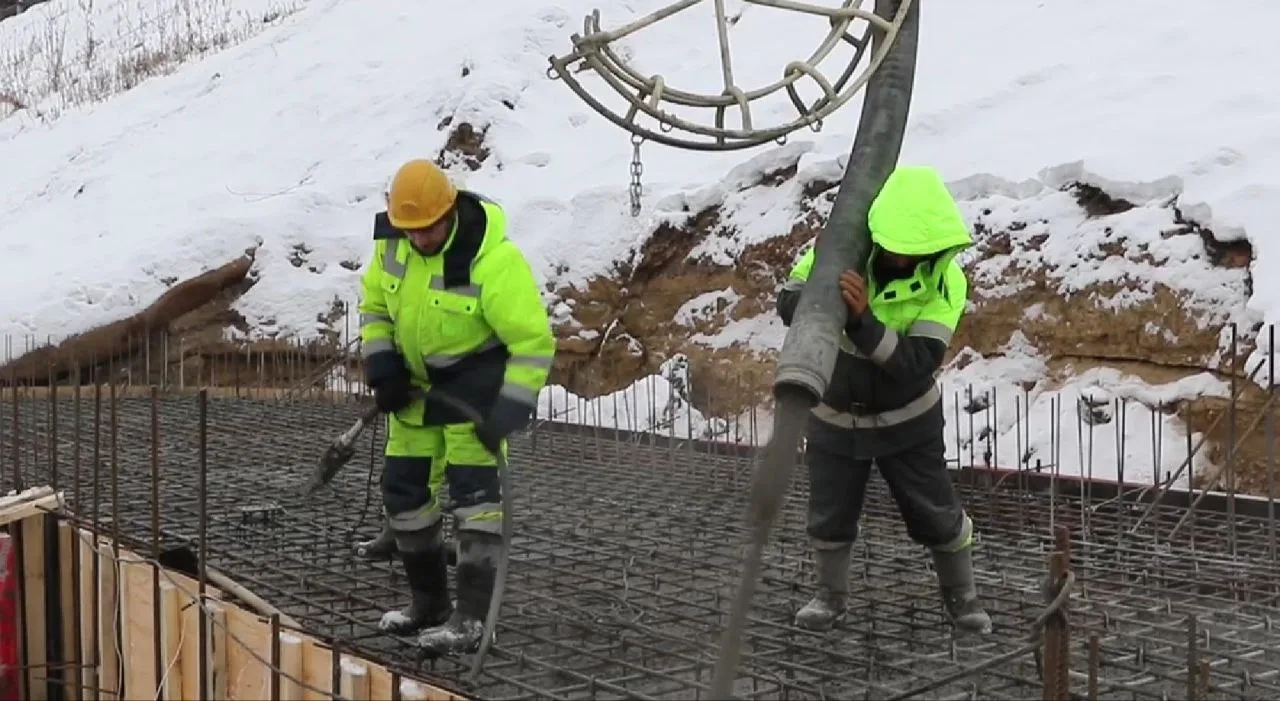 На готовом фундаменте рабочие строят подпорную стенку, которая будет держать склон. Параллельно усиливают грунт специальными анкерами для долговечности и устойчивости всего сооружения.
