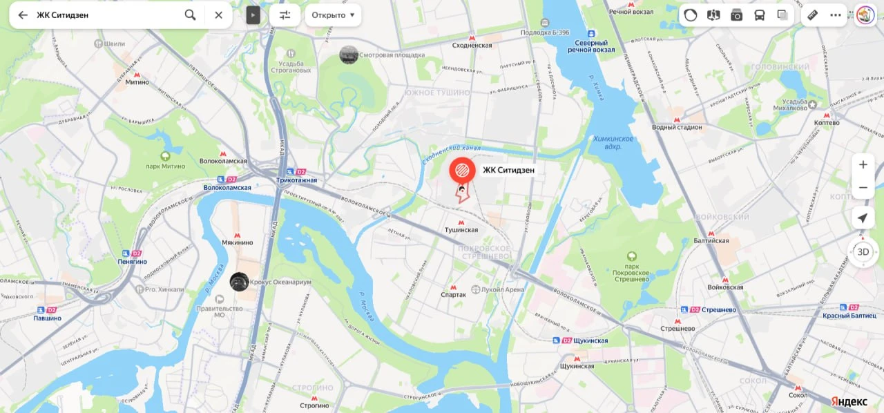 Проект у реки на месте Тушинского аэродрома. До метро «Спартак» пешком 10 мин.
