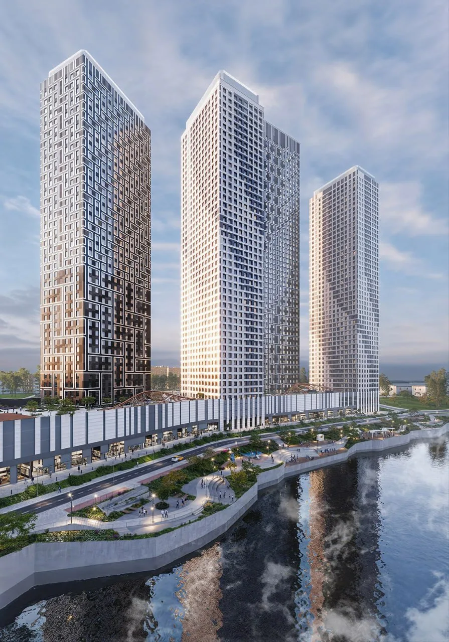 Ждали старт ещё 2 года назад, но время ЖК со странным названием Афиальт пришло только в 2026. С тех пор рендеры ушли от коробочного варианта в сторону эмо-теха. Будет 7 корпусов по 16–58 этажей, собственные школа и детсад, также застройщик благоустроит диковатый берег реки Лихоборки, текущей рядом.