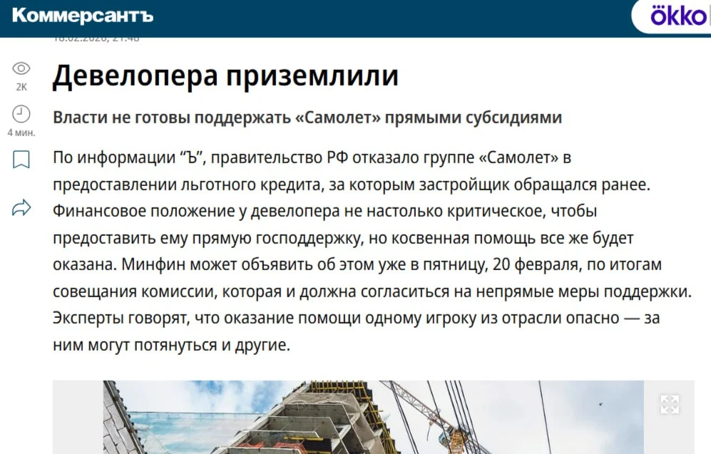 С 1 января Правительство вернуло штрафы для застройщиков за просрочку. Возможно, именно большая сумма претензий дольщиков заставила Самолет обратиться за господдержкой (безуспешно).