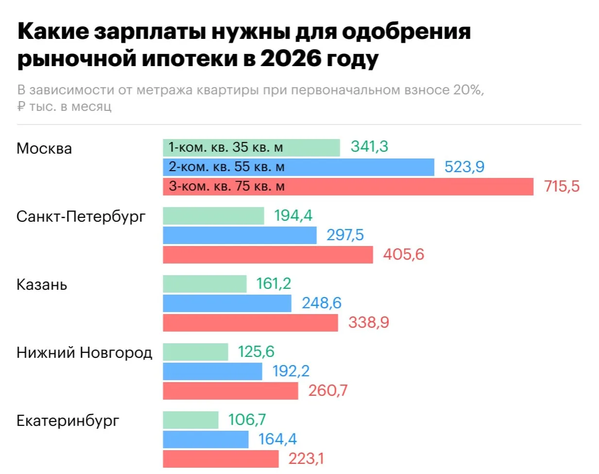 Ставки по рыночной ипотеке понемногу снижаются, но всё равно остаются выше 20%. Для одобрения кредита на двушку нужно зарабатывать больше полумиллиона в месяц. При этом средняя зарплата в столице в конце прошлого года была около 170 тыс.
