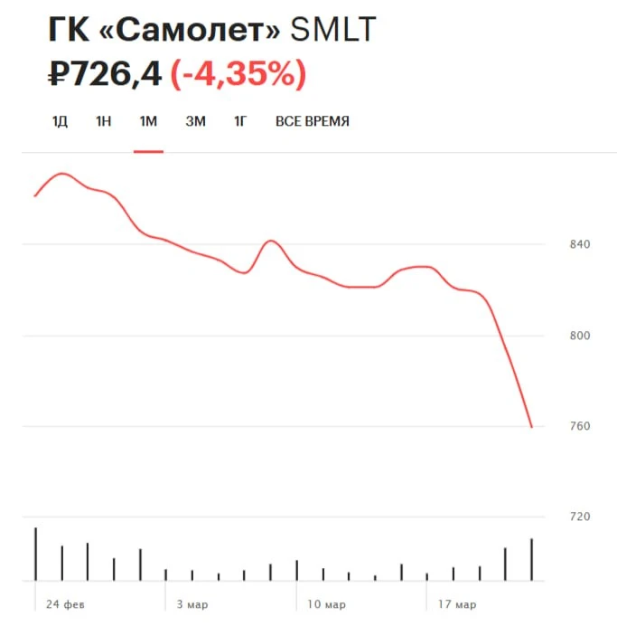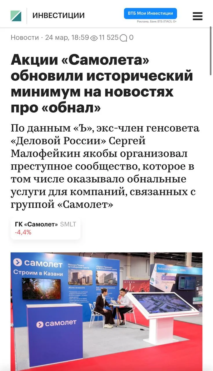 Акции застройщика за день рухнули на 5,64% — до самого низкого уровня за всю историю. Причина — арест одного из руководителей «Деловой России» Сергея Малофейкина.