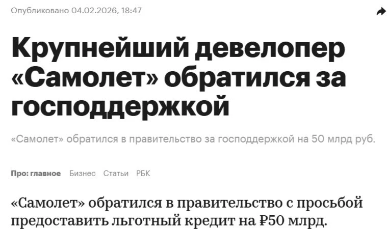 Застройщик обратился к Мишустину с просьбой о льготном кредите или другом «стабилизационном инструменте». Взамен компания готова передать блокирующий пакет акций для участия в управлении. Цена вопроса — 50 млрд руб. Они нужны, чтобы выполнить обязательства перед дольщиками и инвесторами в условиях корректировки льготной ипотеки.