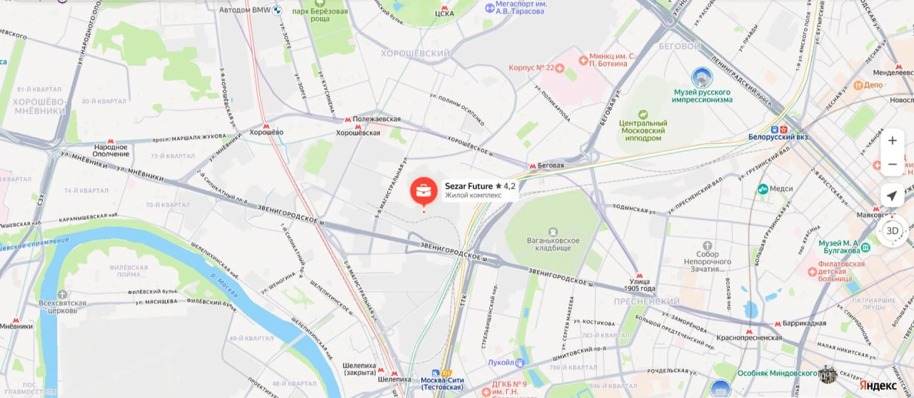 Локацию в деталях разбирали. До метро «Беговая» — 10 минут пешком. Перспективно, но пока вокруг сплошная стройка, рядом Sezar City от Сезар и Amber от ФСК, подальше Jois от MR, Level Звенигородская от Level, Сидней Сити от ФСК и другие. Парков рядом нет, разве что Ваганьковское кладбище...