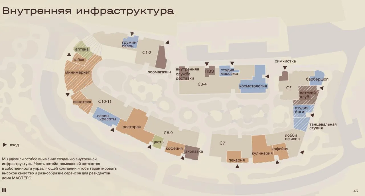 На территории комплекса запланированы общеобразовательная школа, детсад, комьюнити-центр, медцентр, фитнес со СПА. Также будет прочая инфраструктура: коворкинги, игровая, кинозал, гриль-терраса, двухуровневый паркинг, парк и пр.