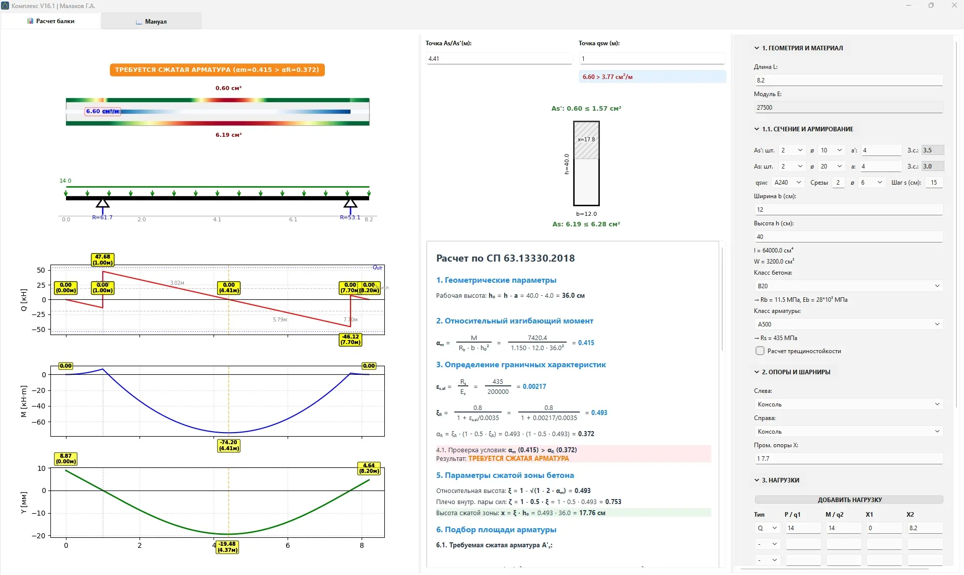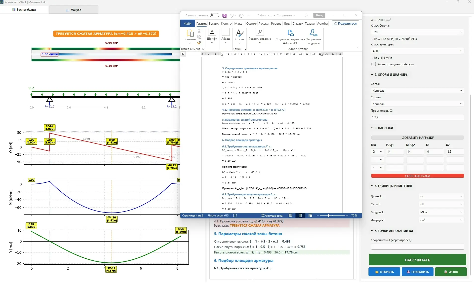 Самым сложным оказался этап синхронизации расчетного ядра с отчетной частью. В ядре программа обсчитывает массив из 1000 точек по всей длине элемента, а в HTML-отчете детально препарируется одна конкретная точка.