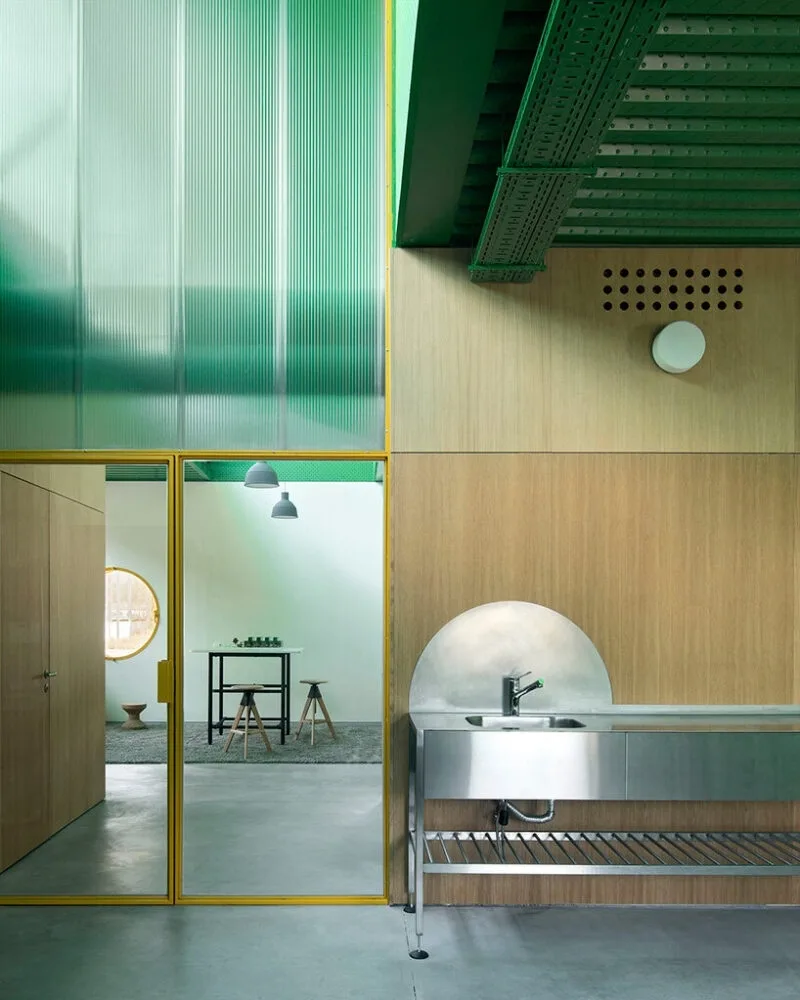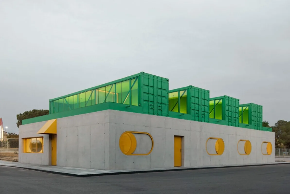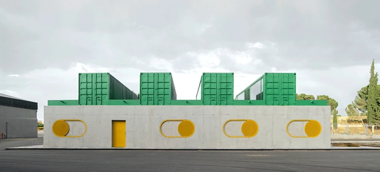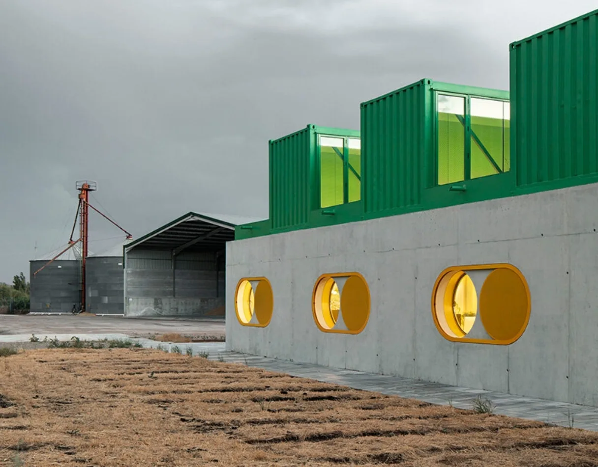 Agrosemillas Offices — это офисное здание площадью 280 м², спроектированное испанским бюро Impepinable Studio в агро-индустриальной зоне близ Мадрида. В проекте используются переоборудованные морские контейнеры, которые размещены на железобетонной конструкции и образуют «зубчатую» крышу с оконными проемами для естественного освещения. Такое решение визуально перекликается с окружающими складами, но создаёт более комфортный, светлый рабочий интерьер.