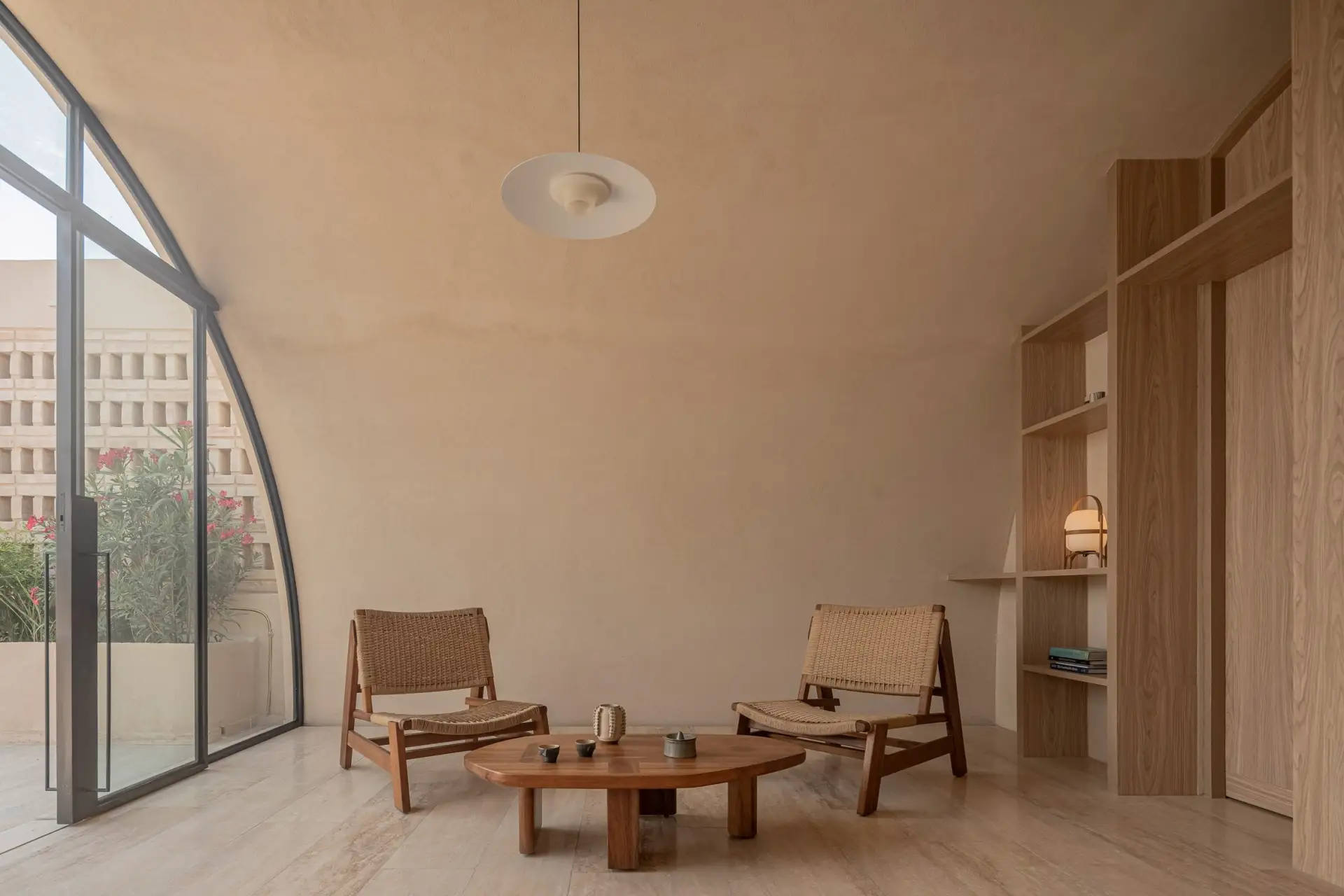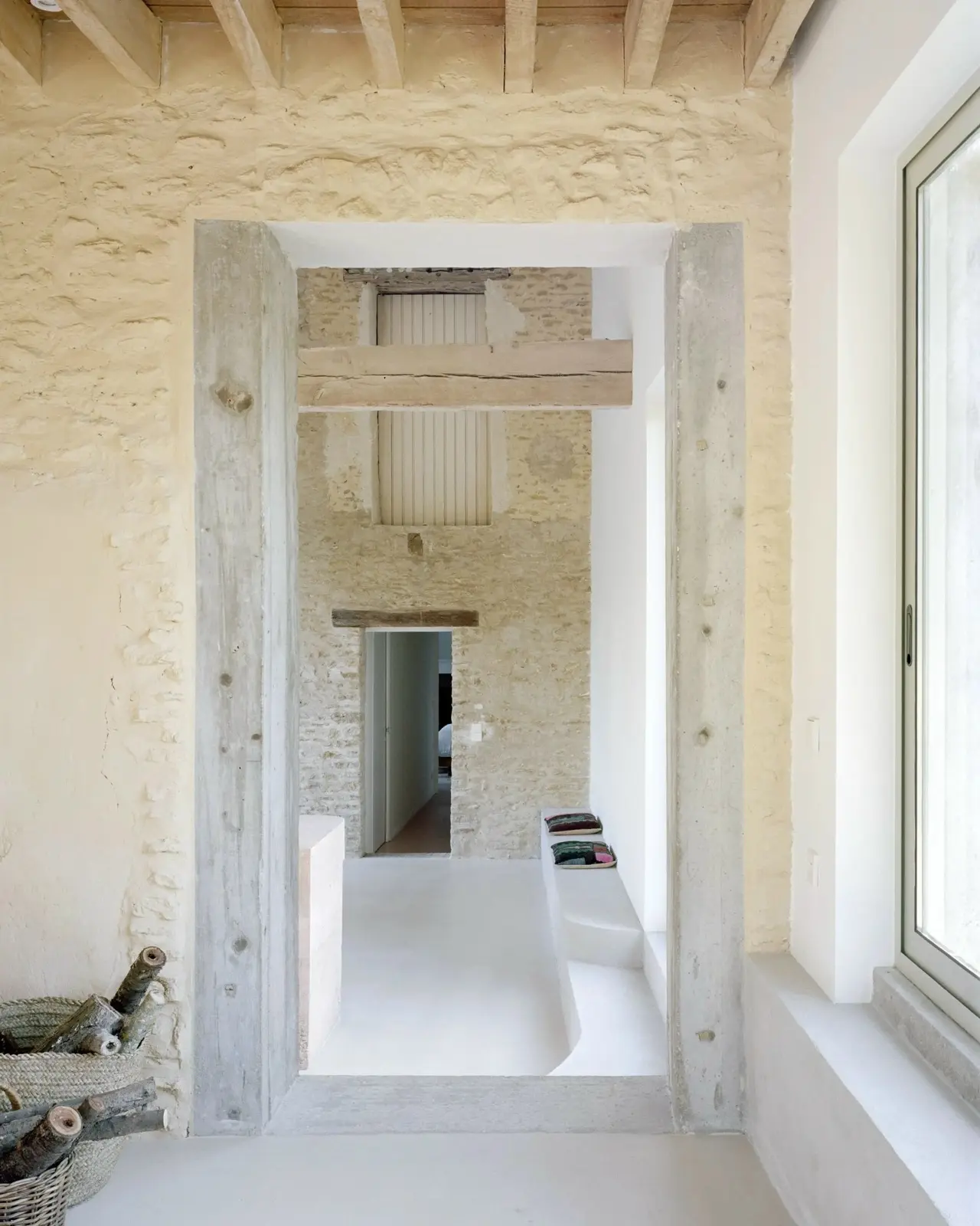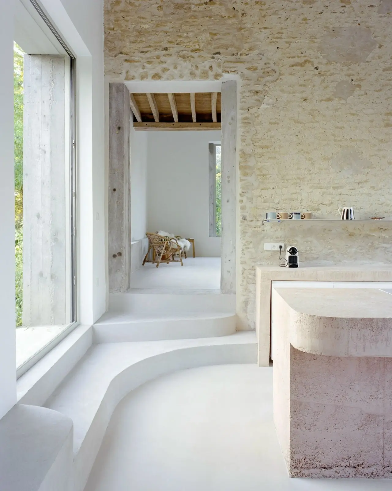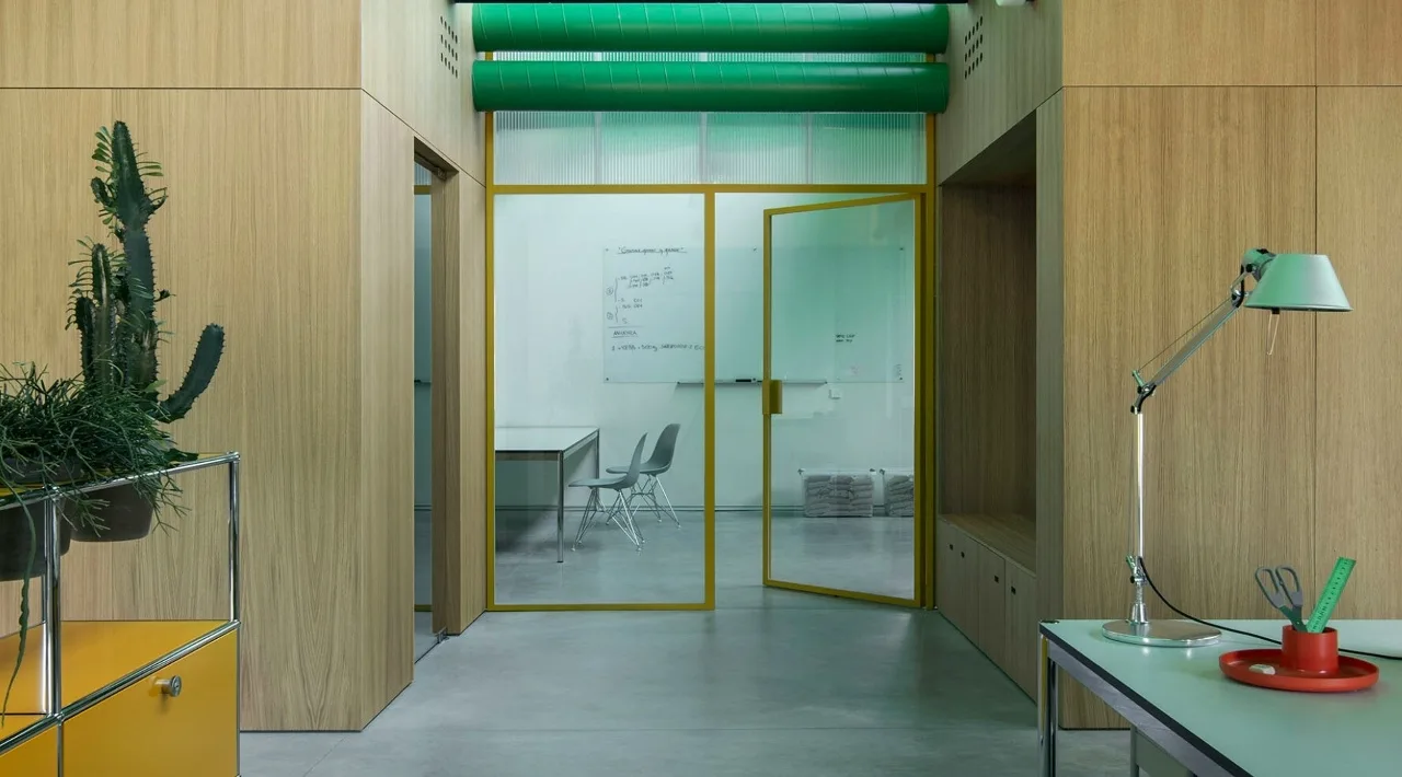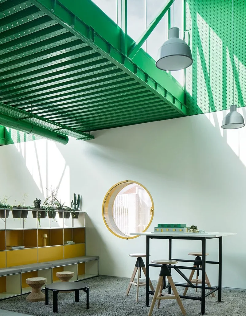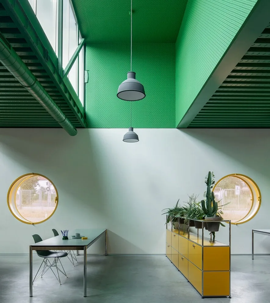 Внутри пространство организовано тремя продольными зонами: открытая рабочая зона, служебные помещения и комнаты для встреч и совещаний. В бетонных стенах предусмотрены круглые окна с крупными жёлтыми створками-роллетами, которые служат не только декоративным элементом, но и регулируют уровень освещенности.