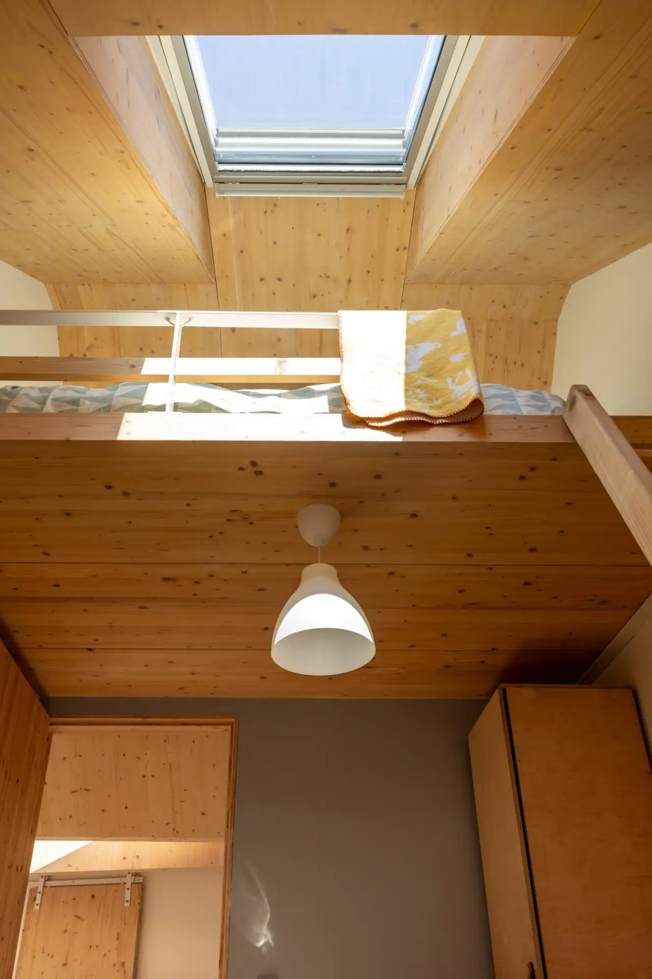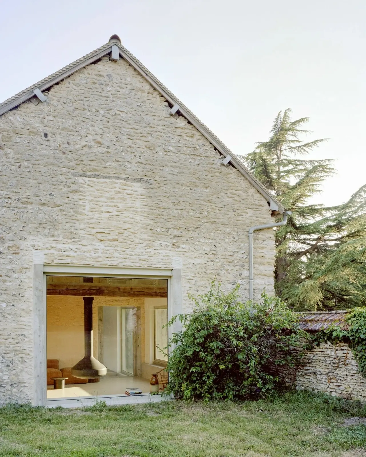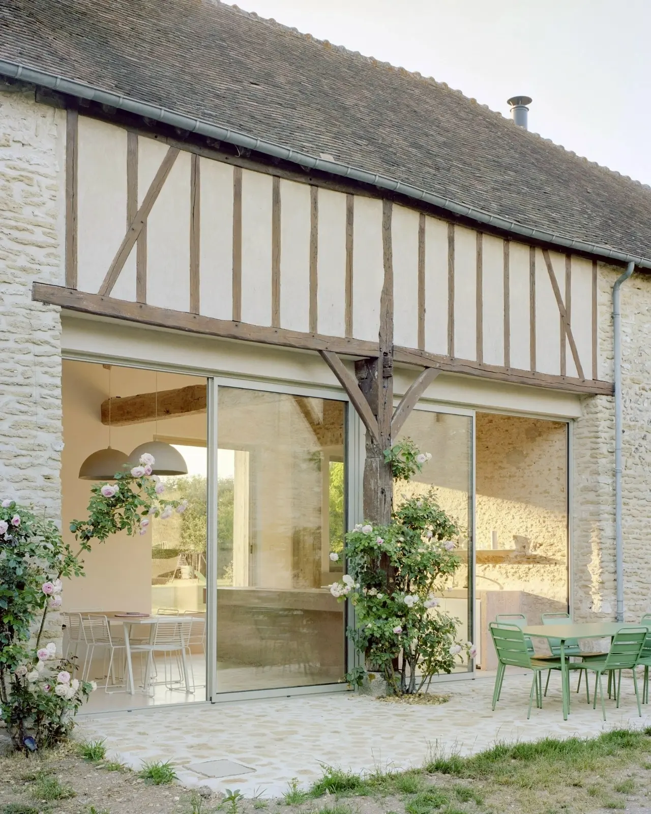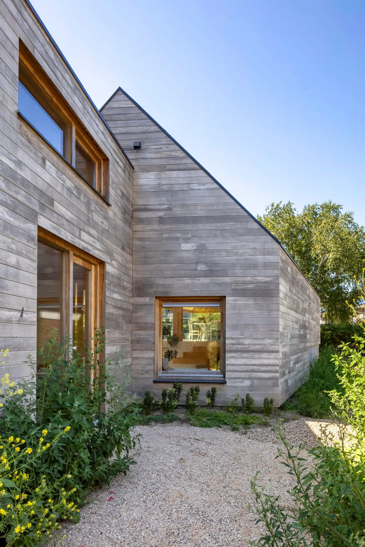 Основные несущие элементы и отделка дома выполнены из массивной древесины. Два простых объёма формируют компактную планировку, а большие проёмы и продуманная ориентация усиливают естественное освещение. В проекте предусмотрена экстенсивная система озеленения скатной кровли. Это улучшает теплоизоляцию, снижает перегрев летом, удерживает дождевую воду и помогает дому лучше вписаться в сельский ландшафт, визуально «растворяя» часть объёма в окружающей среде.