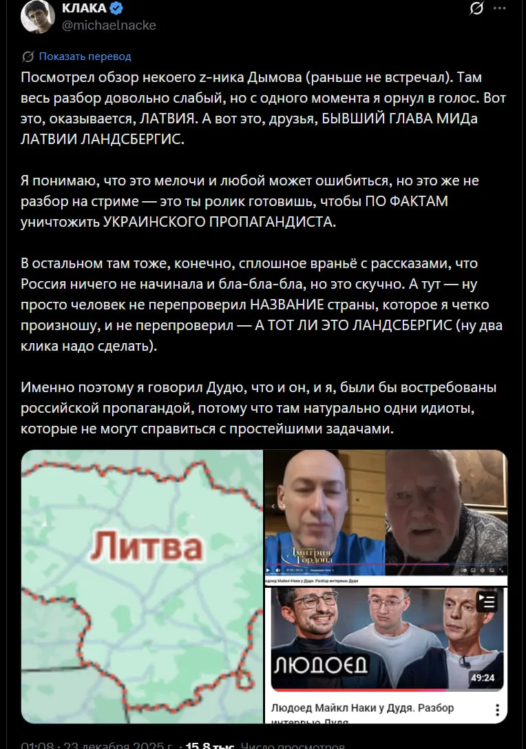 2) С Ландсбергисом я реально напутал, тут мой косяк. Наки говорил про Габриэлюса, который министр иностранных дел Литвы, а я в видео рассказал про его деда, Витаутаса. Меняет ли это суть моих слов о том, что государственный деятель одной из прибалтийских стран — русофоб? Нет, не меняет. Витаутас Ландсбергис сказал, что Россия - это раковая опухоль планеты.