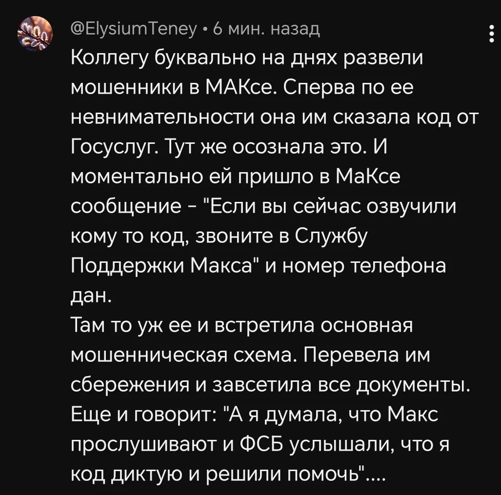 Судя по комментариям, многих сбивает с толку позиционирование Макса как супер защищённой площадки. И поэтому люди попадаются в лапы мошенников.