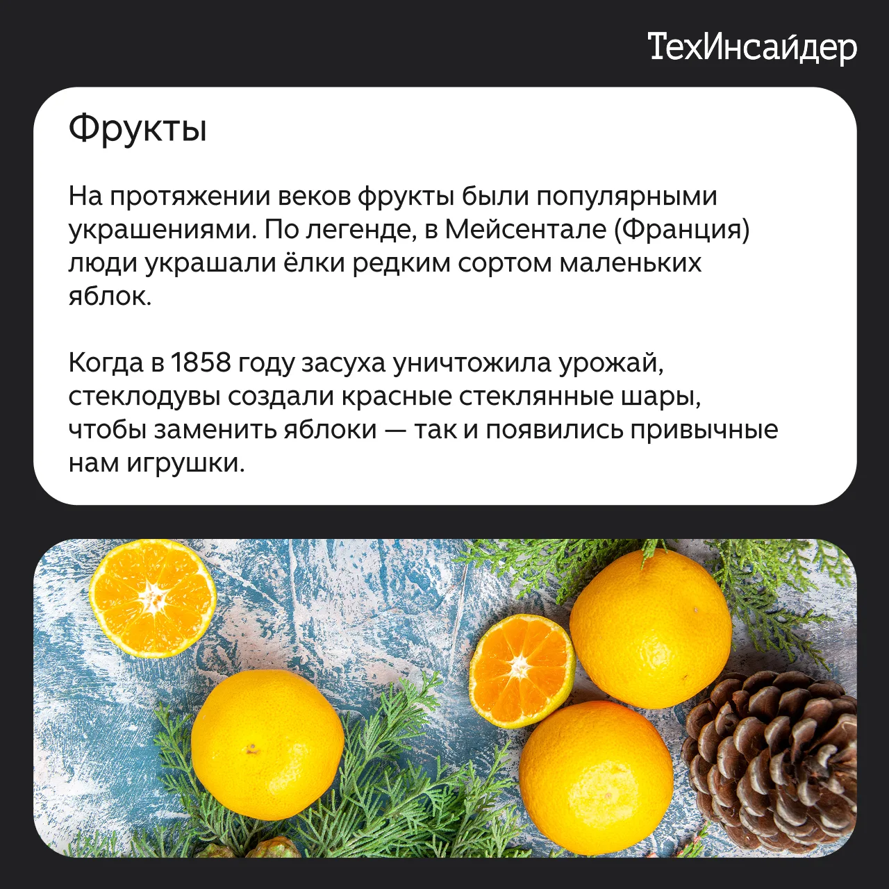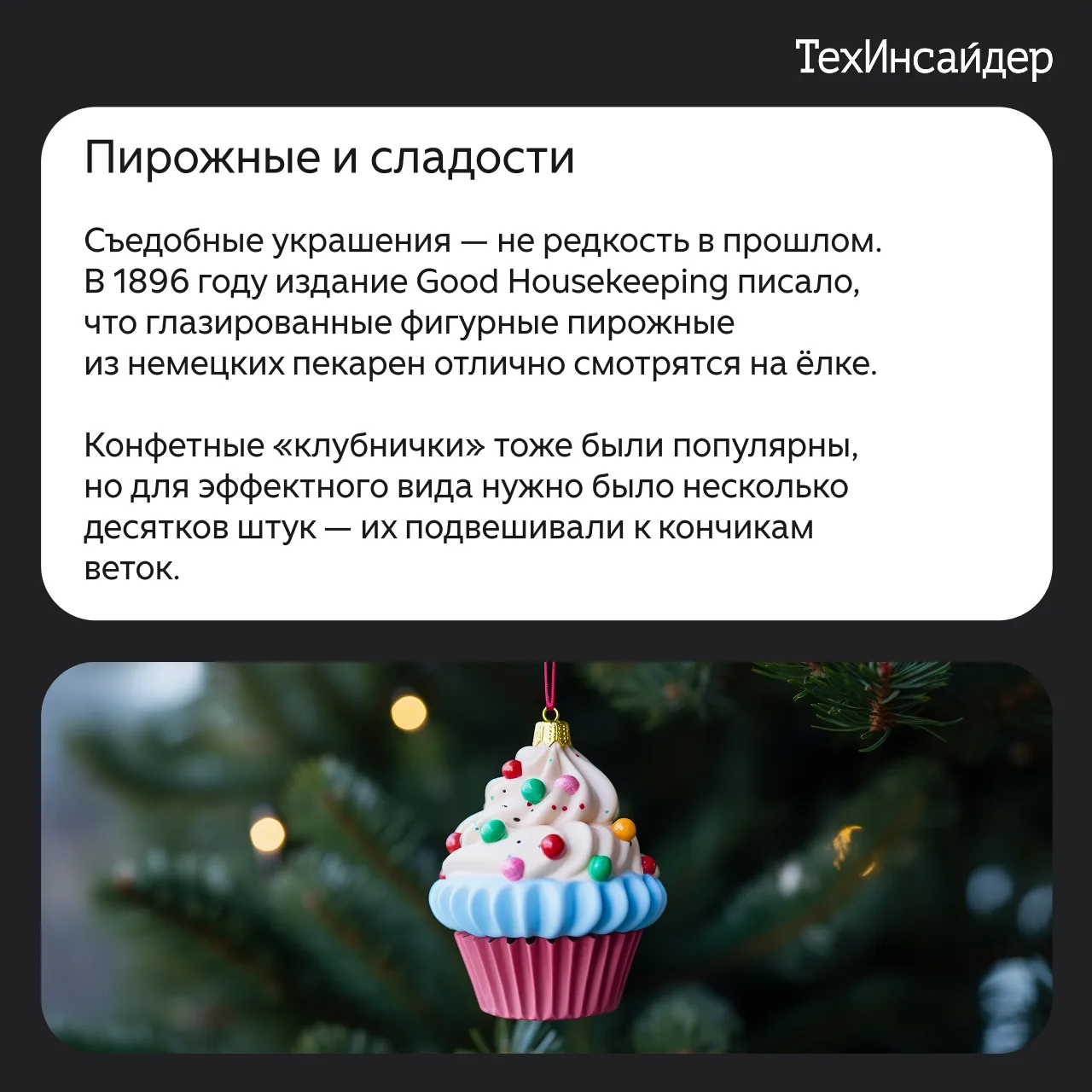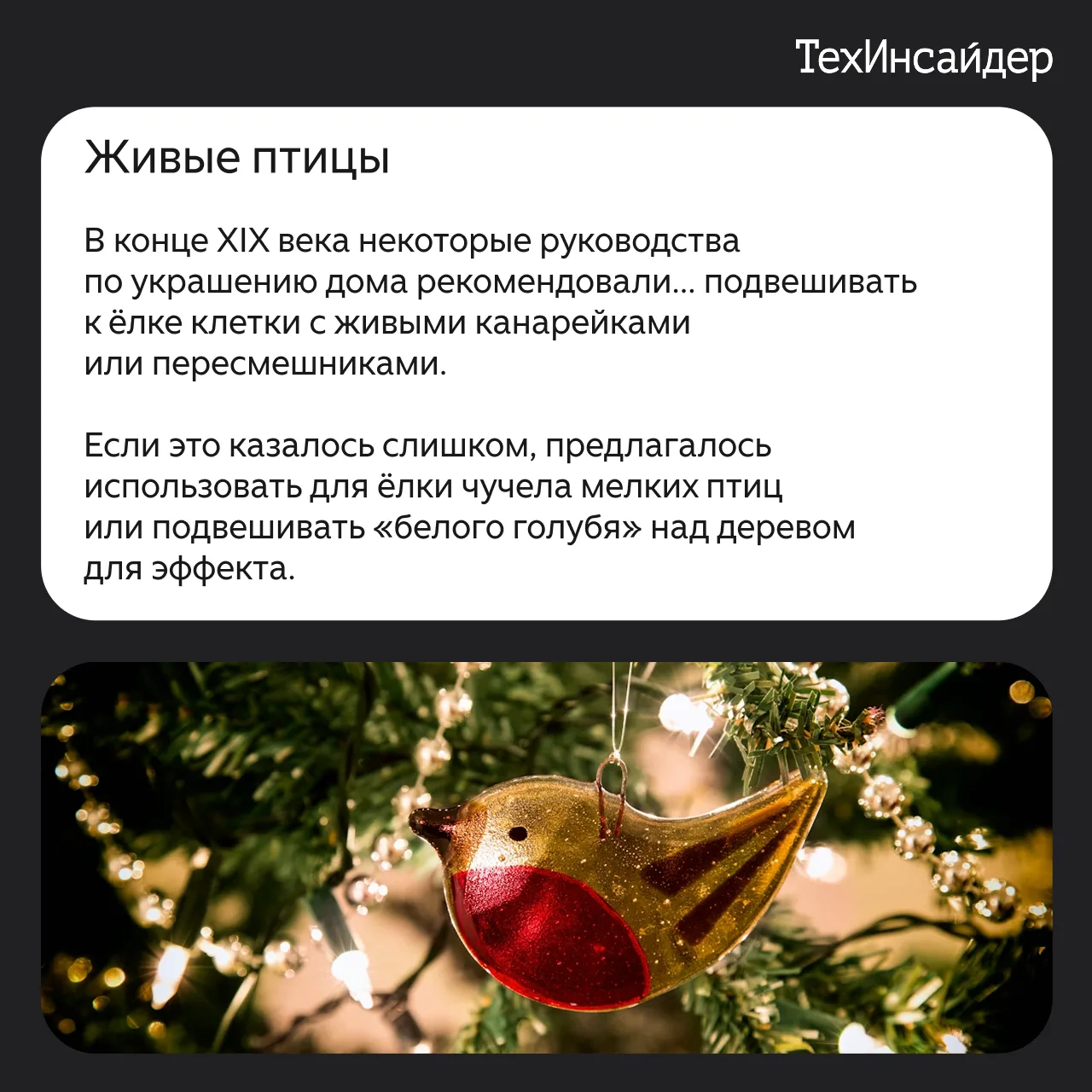 TechInsider.ru изучил, как менялись традиции украшения ёлок с течением веков. Если сегодня мы украшаем ёлки шарами, гирляндами и фигурками, то в старину на дереве красовались початки кукурузы, сладости и даже живые птицы. Этот декор радовал взрослых и детей, но сегодня некоторые вещи смотрелись бы сомнительно, а отдельные даже могли навредить здоровью. Листайте слайды, чтобы узнать больше.