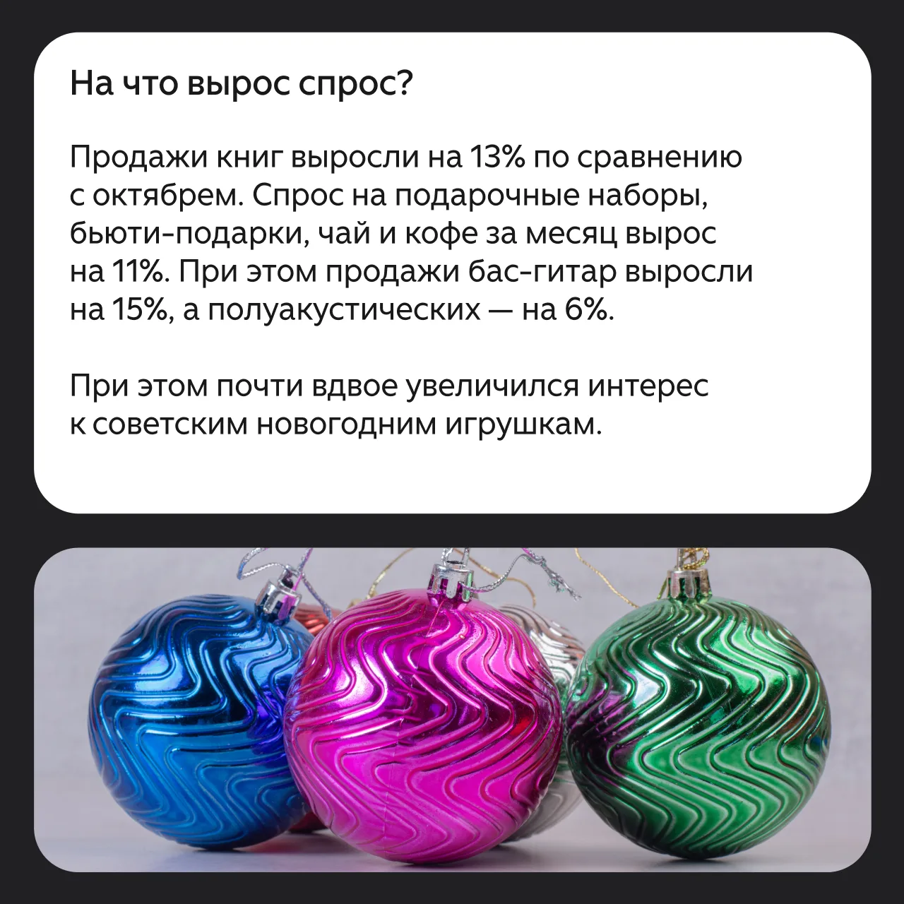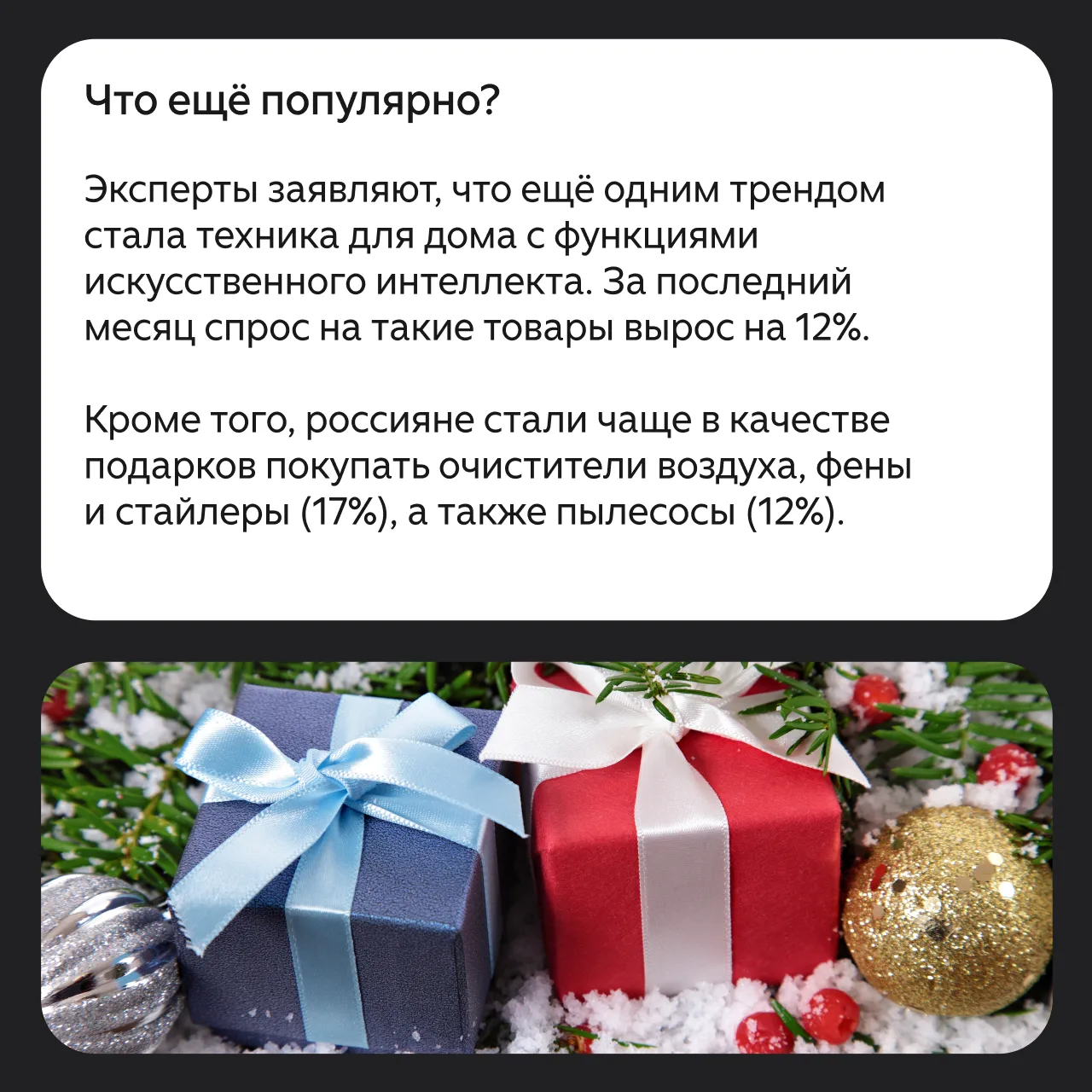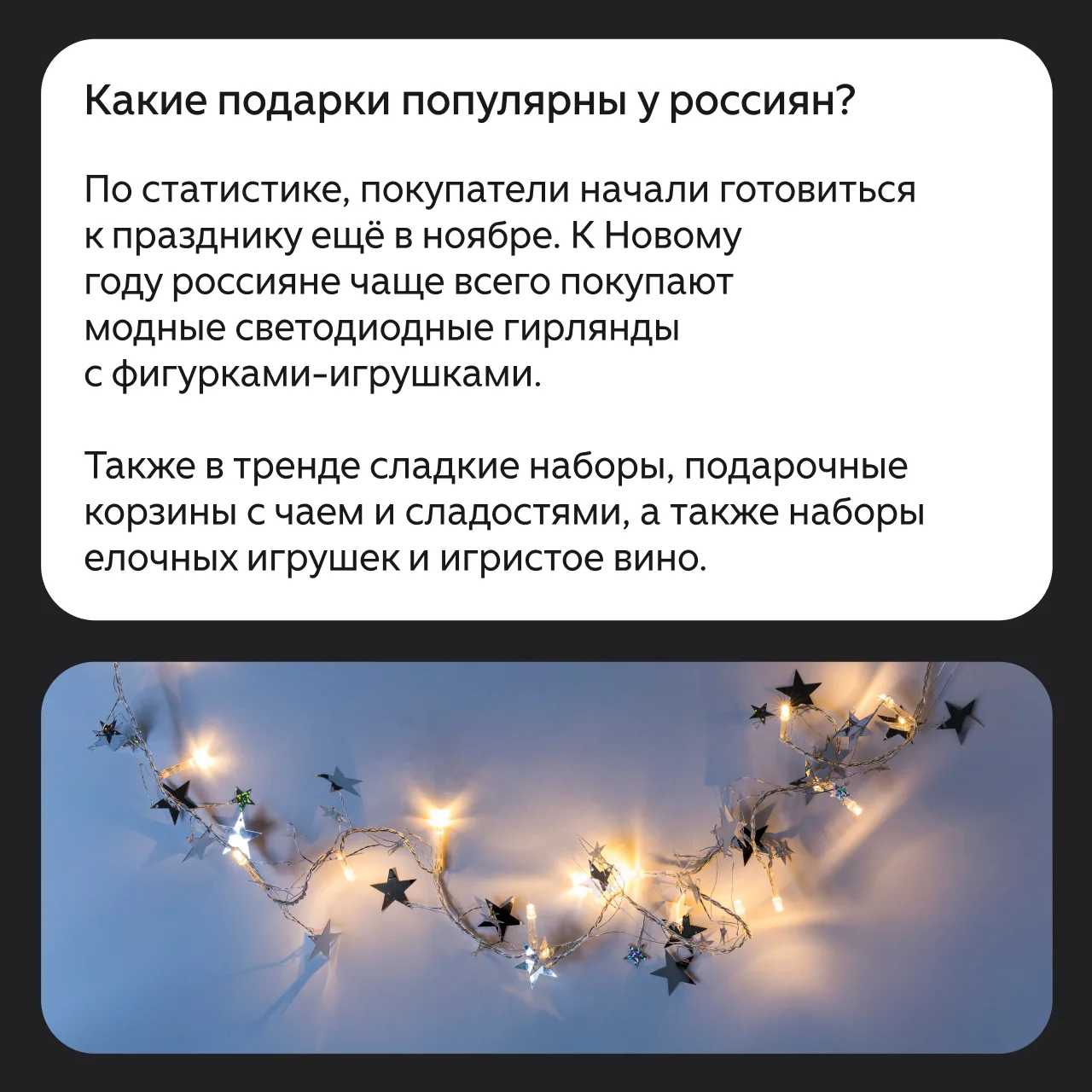 Средняя сумма, которую покупатели готовы тратить на подарки, выросла до 9500 рублей. Неожиданным хитом сезона стала тема ностальгии и детства — россияне всё чаще покупают презенты, которые связаны с тёплыми воспоминаниями. При этом традиционно популярными подарками остаются сладости, бьюти-боксы и новогодние гирлянды.