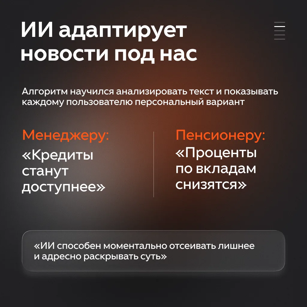 ◾️ Персонализируют контент под интересы. Например, если новость о ставке ЦБ читает автолюбитель, ИИ свяжет её с темой автокредитов.